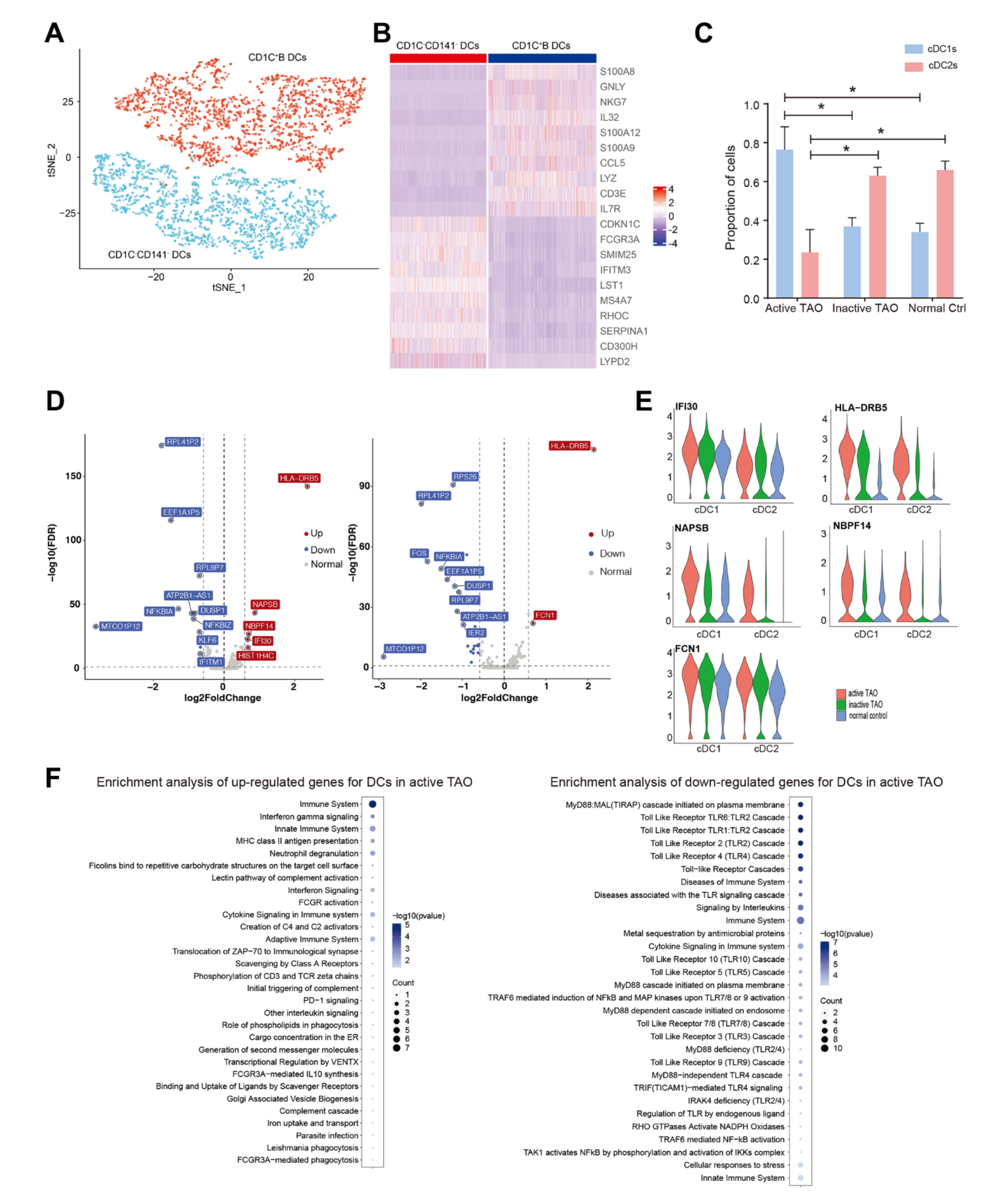 DC被細(xì)分為三個(gè)不同的子簇。Cluster 0被指定為cDC1s,其特征是高表達(dá)CDKN1C、FCGR3A、SMIM25、IFITM3、LST1和MS4A7,以及CD1C和 CD141的低表達(dá)。簇1和簇2被鑒定為cDC2,其炎癥基因的表達(dá)水平升高,例如 CD14、S100A8、GNLY、NKG7 、IL32和S100A12(圖5A、5B)。cDC1s的比例在活性TAO中顯著較高,而cDC2s在非活性TAO和NC中更為普遍(圖 5C)。鑒于cDC1和cDC2在免疫調(diào)節(jié)中發(fā)揮不同的作用- cDC1專(zhuān)門(mén)誘導(dǎo)Th2反應(yīng),而cDC2亞群表現(xiàn)出更強(qiáng)大的誘導(dǎo)Th1反應(yīng)的能力[42],該研究進(jìn)一步檢查了它們的基因表達(dá)譜。