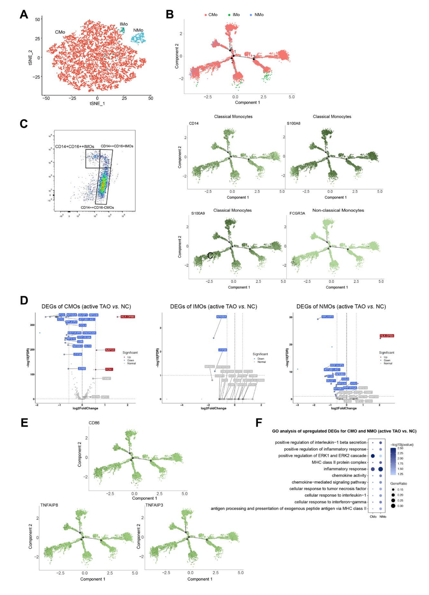 作者的聚類(lèi)分析成功地從總共 12,959 個(gè)單核細(xì)胞中識(shí)別出三個(gè)不同的亞群。第一個(gè)簇的特征是經(jīng)典單核細(xì)胞 (CMO),其表現(xiàn)出高表達(dá)水平的CD14、S100A8 和 S100A9。第二個(gè)簇被鑒定為非經(jīng)典單核細(xì)胞 (NMO),其特征是高表達(dá)FCGR3A(也稱(chēng)為 CD16)。第三簇被識(shí)別為中間單核細(xì)胞 (IMO),CD14和FCGR3A均高表達(dá)(圖6A、6B)。為了驗(yàn)證這些單核細(xì)胞亞簇,進(jìn)行了流式細(xì)胞術(shù)分析,確認(rèn) CMO為CD14++CD16-,NMO為CD14+CD16++,IMO為CD14++CD16+(圖6C)。軌跡推斷分析表明,單核細(xì)胞遵循從CMO開(kāi)始并向NMO和IMO狀態(tài)分支的發(fā)育軌跡(圖6B)。這些對(duì)TAO期間單核細(xì)胞發(fā)育狀態(tài)變化的觀察表明它們?cè)谠摷膊≈械臐撛谧饔谩?/strong>