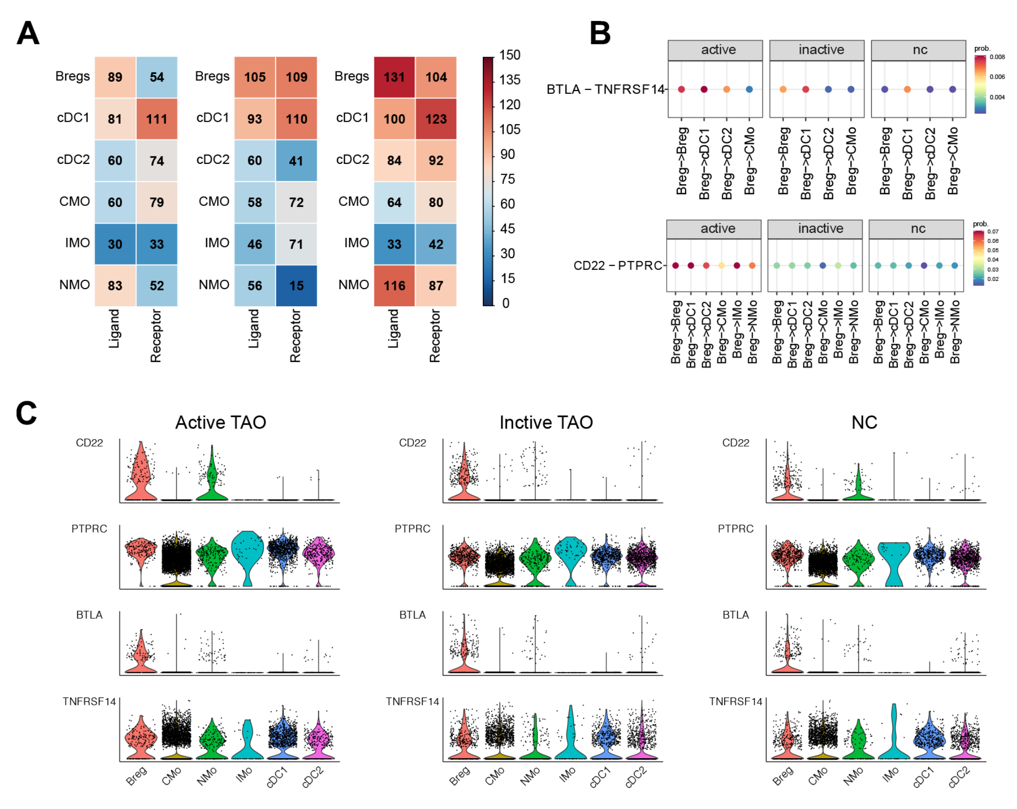 進(jìn)一步檢查了活躍TAO背景下Breg、DC和單核細(xì)胞之間的細(xì)胞相互作用。該分析總共確定了1,352對(duì)重要的相互作用。值得注意的是,Bregs被發(fā)現(xiàn)表現(xiàn)出最多數(shù)量的配體,而cDC1亞簇則表現(xiàn)出最多數(shù)量的受體。值得注意的是,與非活性TAO 和正常對(duì)照組(NC)相比,Bregs在活性TAO中顯示出配體數(shù)量增加(圖7A)。