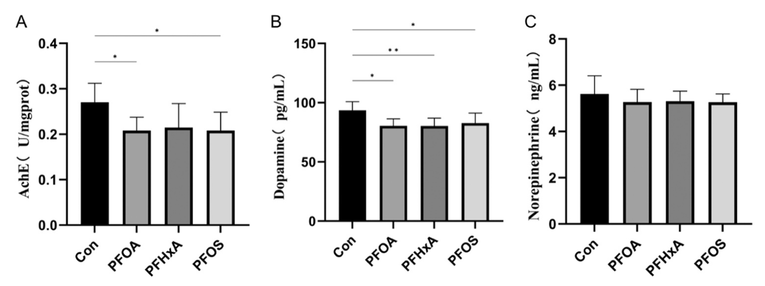 研究了PFAS對鯽魚腦組織乙酰膽堿酯酶和神經(jīng)遞質(zhì)活性的影響。與Con組相比,PFOA和PFOS組腦內(nèi)乙酰膽堿酯酶活性顯著降低。此外,PFOA、PFHxA和PFOS組多巴胺(DA)水平顯著降低(圖2B)。然而,去甲腎上腺素(NE)水平在實驗魚組之間沒有顯著變化(圖2C)。這些結(jié)果表明,PFAS暴露抑制了魚腦中的AChE和神經(jīng)遞質(zhì)水平,并影響了整體腦功能。