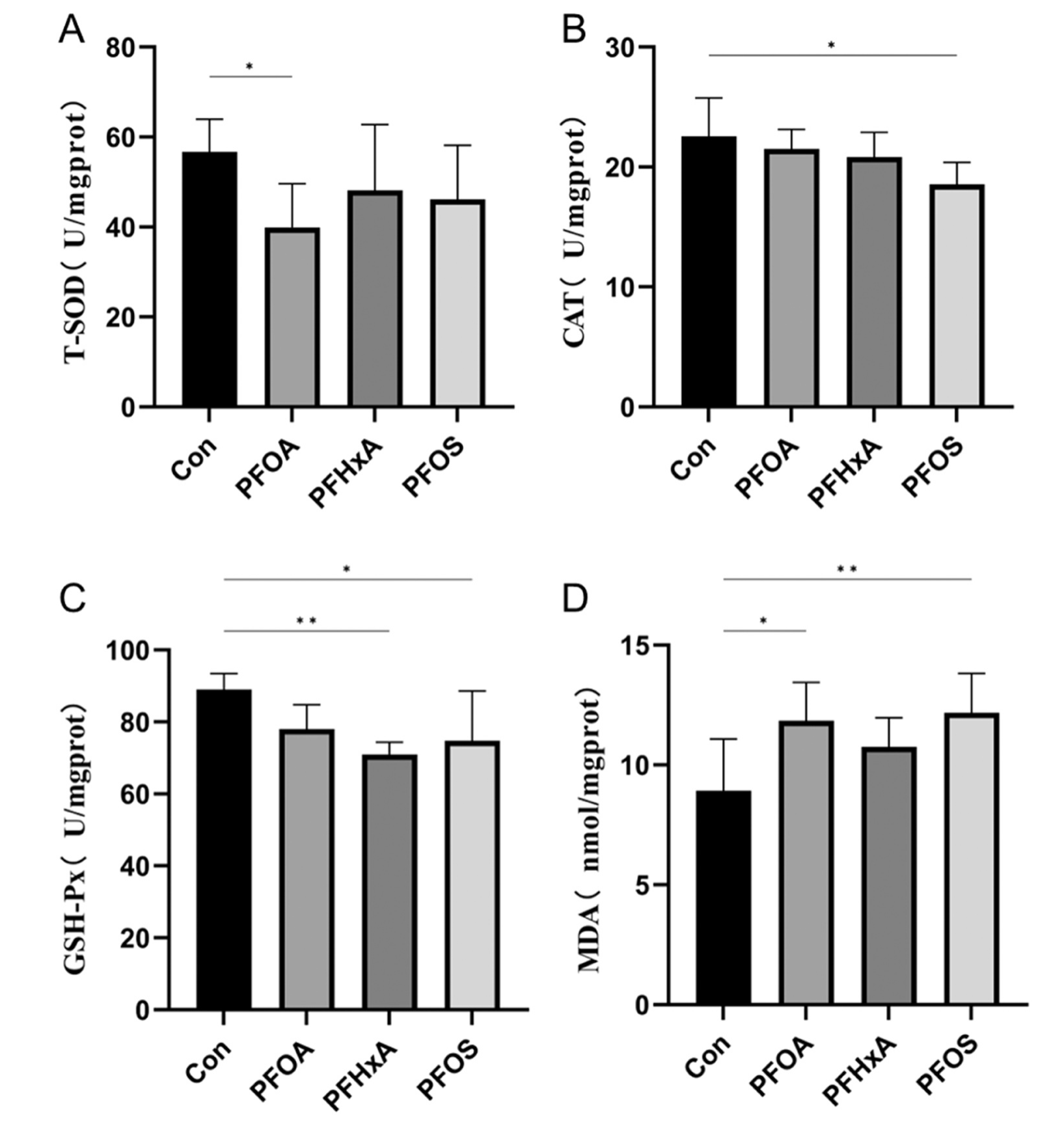 處理條件:對照組(Con)、全氟辛烷磺酸(PFOS)、全氟辛酸(PFOA)、十一氟己酸(PFHxA)組指標檢測:過氧化氫酶(CAT)、總超氧化物歧化酶(T-SOD)、谷胱甘肽過氧化物酶(GSH-Px)、丙二醛(MDA)、乙酰膽堿酯酶(AChE)