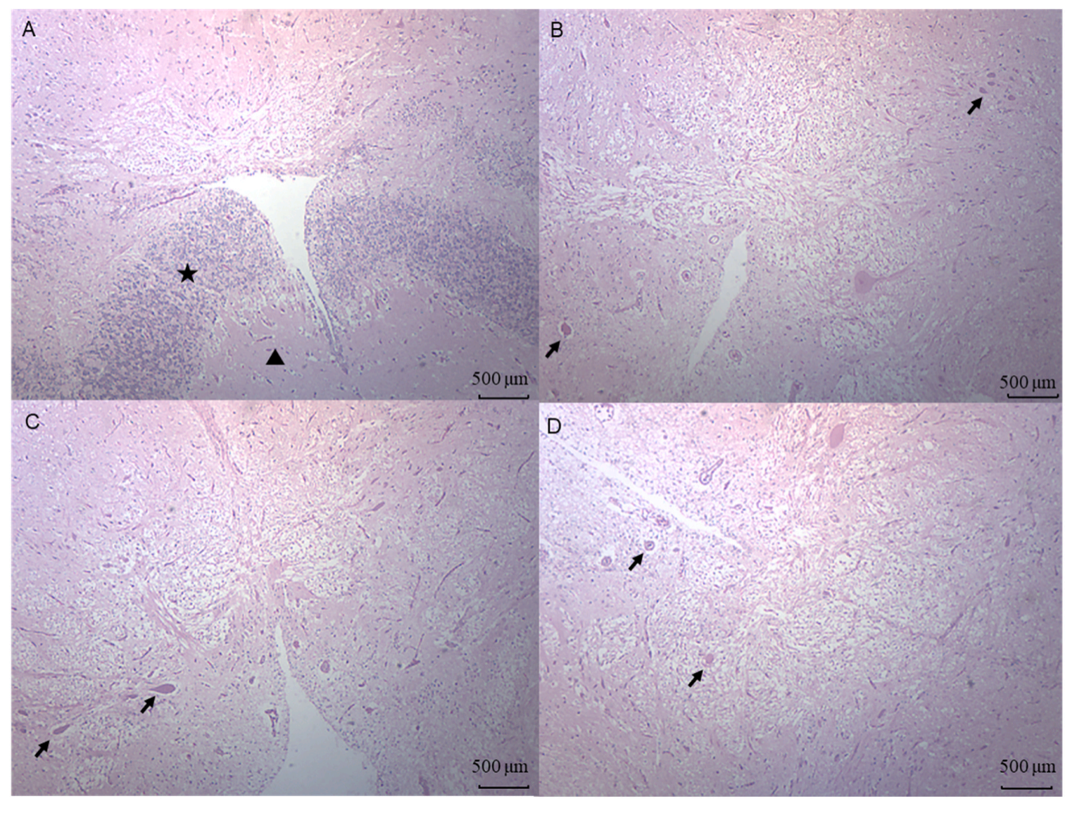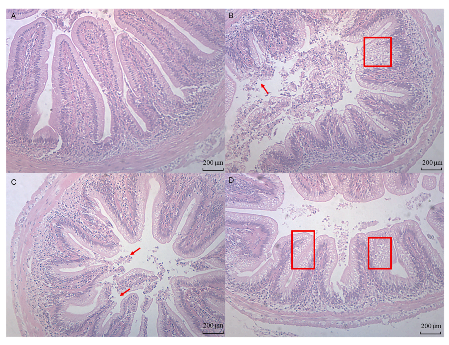 組織病理學染色分析各暴露組腦、腸基本變化。Con組腦組織組織結(jié)構(gòu)正常,包括正常的浦肯野細胞層和分子層(圖3A)。pfas治療組神經(jīng)周圍明顯空泡化。此外,PFHxA和PFOS組可見廣泛的多灶性脫鞘(圖3B和C)。在PFOA組,充血血管壁透明化,靠近收縮的神經(jīng)元,神經(jīng)周圍形成空泡(圖3D)。Con組鯽魚腸黏膜形態(tài)結(jié)構(gòu)完整,腸黏膜上皮細胞細胞核排列緊密整齊,無損傷跡象(圖4A)。在每個pfas處理組中,絨毛膜絨毛的長度顯著減少,并與一定程度的損傷有關(guān)。PFHxA和PFOS組觀察到上皮粘膜破裂(圖4B和C), PFHxA和PFOA組腸絨毛萎縮、空泡化、細胞核紊亂(圖4B和D)。H&E染色結(jié)果表明,PFAS暴露對鯽魚腸道和腦組織造成損傷。