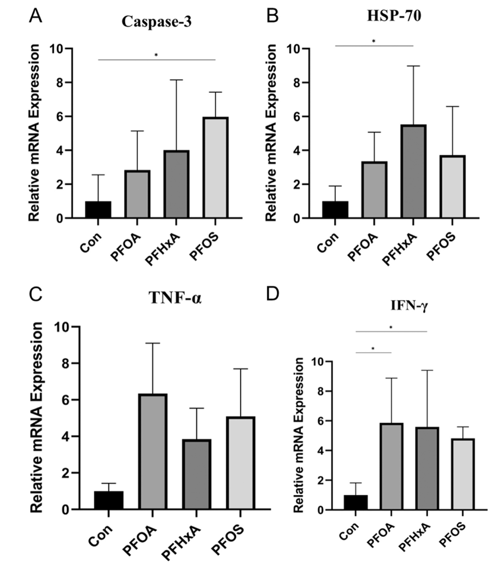 PFOS組與Con組相比,應激相關(guān)基因caspase-3的表達顯著升高(圖5A)。同樣,在PFHxA組中,HSP-70的表達顯著增加(圖5B)。此外,促炎細胞因子INF-γ在PFOA和PFHxA組中的表達水平顯著升高(圖5D),而TNF-α的表達在兩組間無顯著差異(圖5C)。