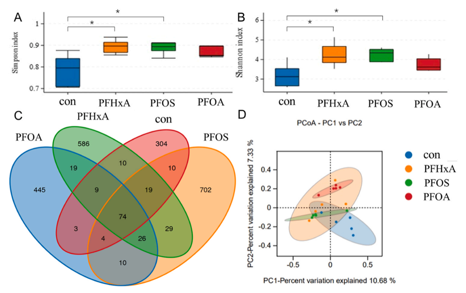 與Con組相比,PFHxA和PFOS組細菌群落的Simpson和Shannon指數(shù)明顯高于Con組(圖6A和B),表明細菌物種多樣性有所增加?;贠TU的venn圖分析(圖6C),四組之間重疊OTUs數(shù)量相對較少(不超過100個),各組特有的OTUs相對較多(均超過300個)。圖6D清楚地顯示了Con組與其他三組在微生物群方面的顯著差異,表明PFAS暴露引起了鯽魚腸道微生物群組成的變化。
