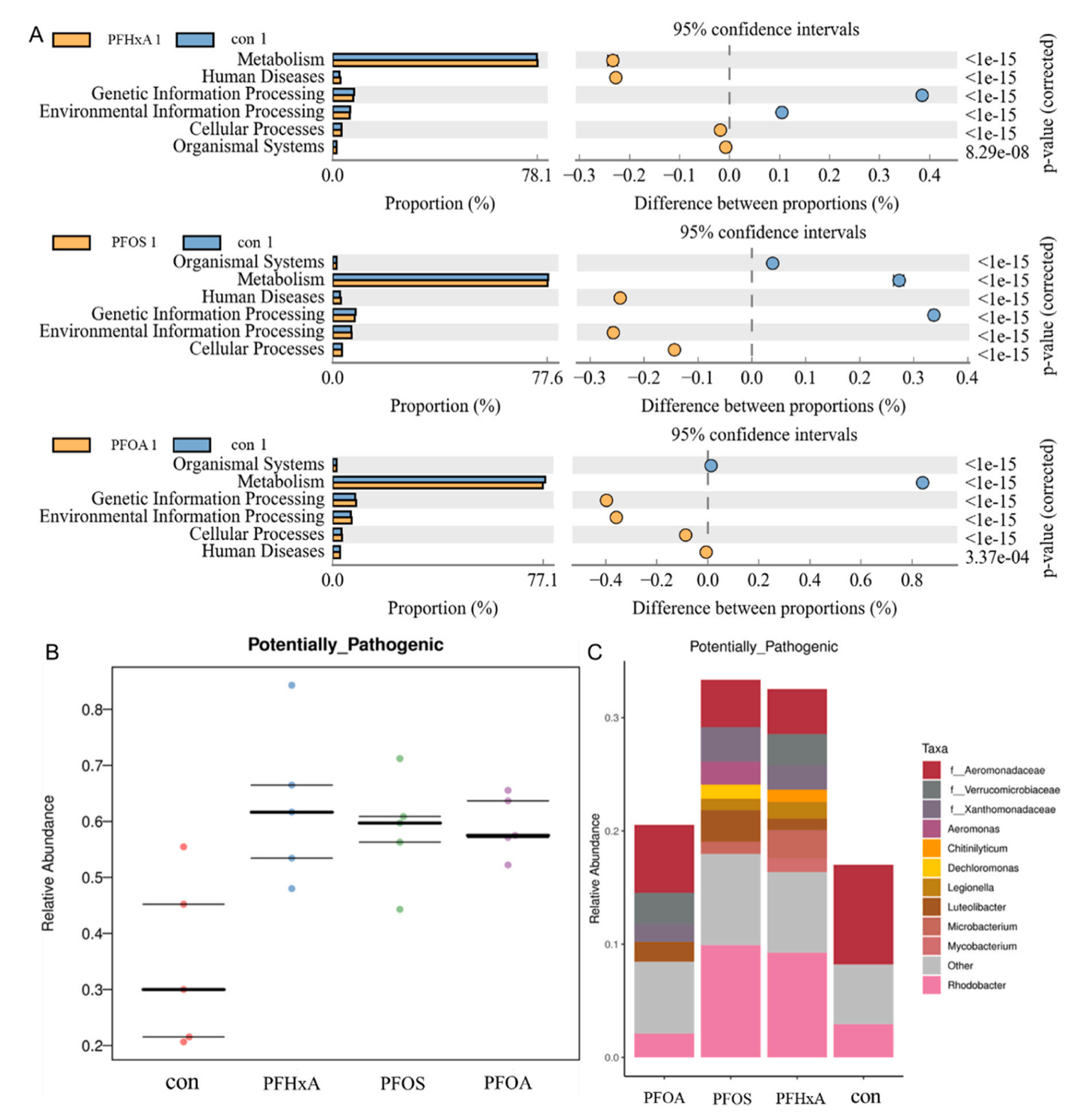 根據(jù)PICRUSt2,根據(jù)特征序列預測整個群落的通路變化,并進行功能基因差異分析。與Con組相比,所有三個PFAS治療組都顯著改善了人類疾病中涉及的細胞過程和信號通路(圖8A)。利用BugBase對表型分類進行預測。與Con組相比,每個PFAS治療組顯著增加了微生物群的潛在致病性(圖8B)。在屬水平上,與Con組相比,各PFAS處理組增加了Luteolibacter的相對豐度,PFOS和PFHxA組增加了Rhodobacter和Legionella的相對豐度,PFOS組增加了decchloromonas和Aeromonas的相對豐度(圖8C)。這些結(jié)果表明,PFAS可能導致鯽魚腸道菌群的潛在致病性增加。