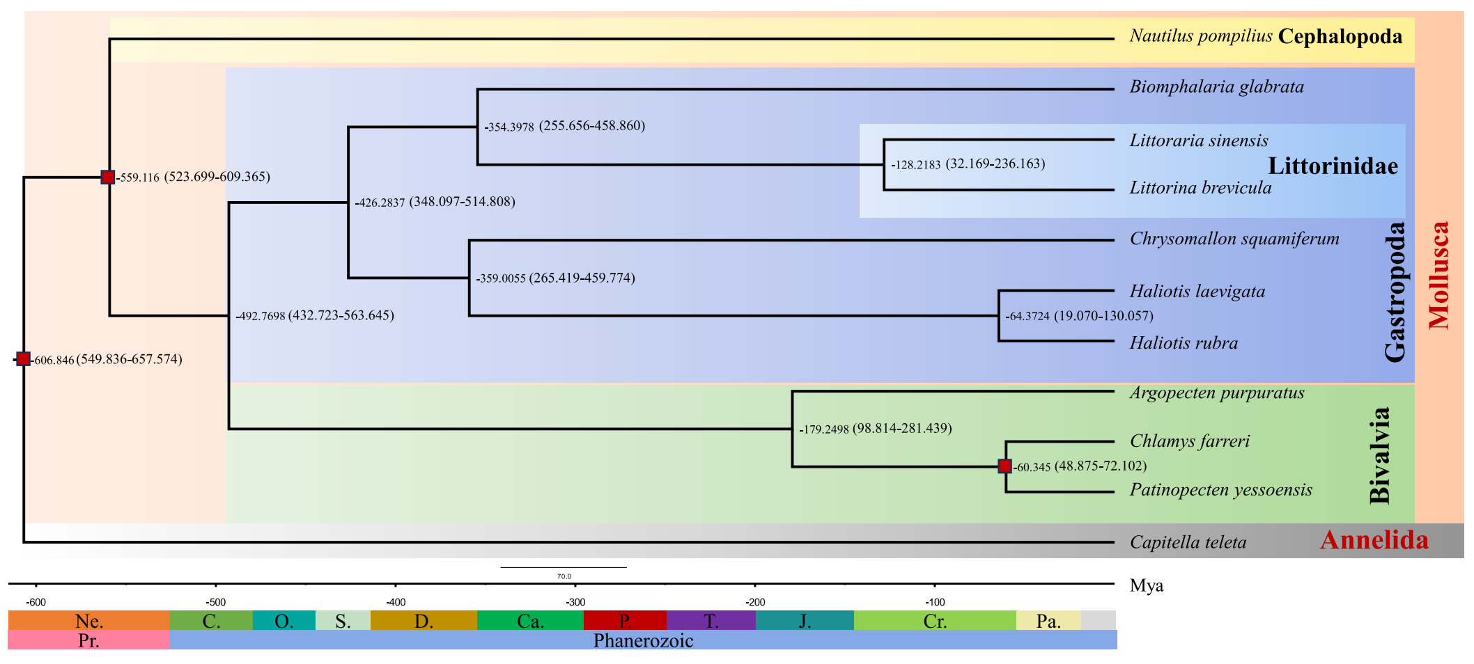 通過比較基因組學(xué)分析構(gòu)建了包括兩種濱螺在內(nèi)的11個物種的系統(tǒng)發(fā)育樹,并估算兩種濱螺的分化時間大約在128.22Mya前。進(jìn)一步的研究結(jié)果表明與刺激反應(yīng)、代謝過程、先天免疫和抗氧化反應(yīng)相關(guān)的基因或基因家族可能在濱螺應(yīng)對潮間帶多種環(huán)境因子脅迫的過程中發(fā)揮著重要作用,受損核酸和蛋白的修復(fù)或降解可能是濱螺在多重壓力下抵抗細(xì)胞凋亡、維持細(xì)胞內(nèi)穩(wěn)態(tài)的主要方式。相關(guān)研究結(jié)果為潮間帶無脊椎動物適應(yīng)性進(jìn)化分子機(jī)制的后續(xù)研究提供了基礎(chǔ)。