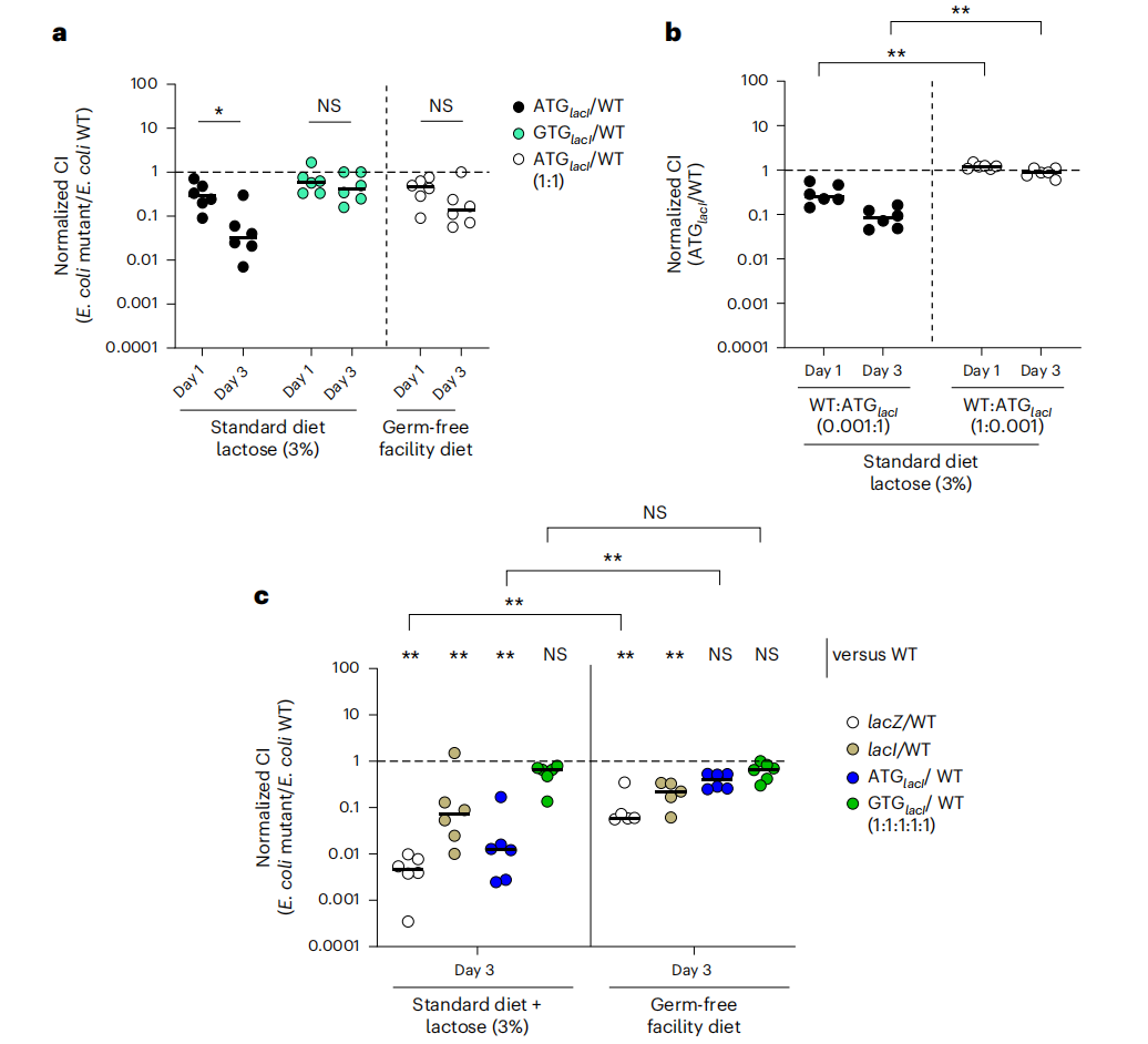 2024年8月19日,瑞士蘇黎世聯(lián)邦理工學(xué)院Wolf-Dietrich Hard團(tuán)隊(duì)在Nature microbiology期刊發(fā)表題為“Non-canonical start codons confer context-dependent advantages incarbohydrate utilization for commensal E. coli?in the murine gut”的論文,研究者分析了小鼠腸道共生大腸桿菌 8178 中的乳糖利用操縱子,發(fā)現(xiàn)乳糖利用相關(guān)的 lacI 基因的起始密碼子并非經(jīng)典的 ATG,而是 GTG,增強(qiáng)了其對(duì)乳糖的利用能力,揭示了非經(jīng)典起始密碼子在代謝競(jìng)爭(zhēng)中的重要功能。