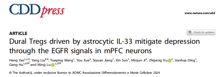 2024年11月,南京醫(yī)科大學(xué)基礎(chǔ)醫(yī)學(xué)院藥理學(xué)系魯明教授、胡剛教授團隊在Cell Death & Differentiation發(fā)表題為”Dural Tregs Driven by Astrocytic IL-33 Mitigate Depression Through the EGFR Signals in mPFC Neurons”的研究論文,使用單細(xì)胞轉(zhuǎn)錄組測序技術(shù)等多種技術(shù),深入闡述小鼠硬腦膜免疫細(xì)胞的抗抑郁機制,為抑郁癥治療提供了新的潛在治療靶點。接下來是本文的詳細(xì)解讀。