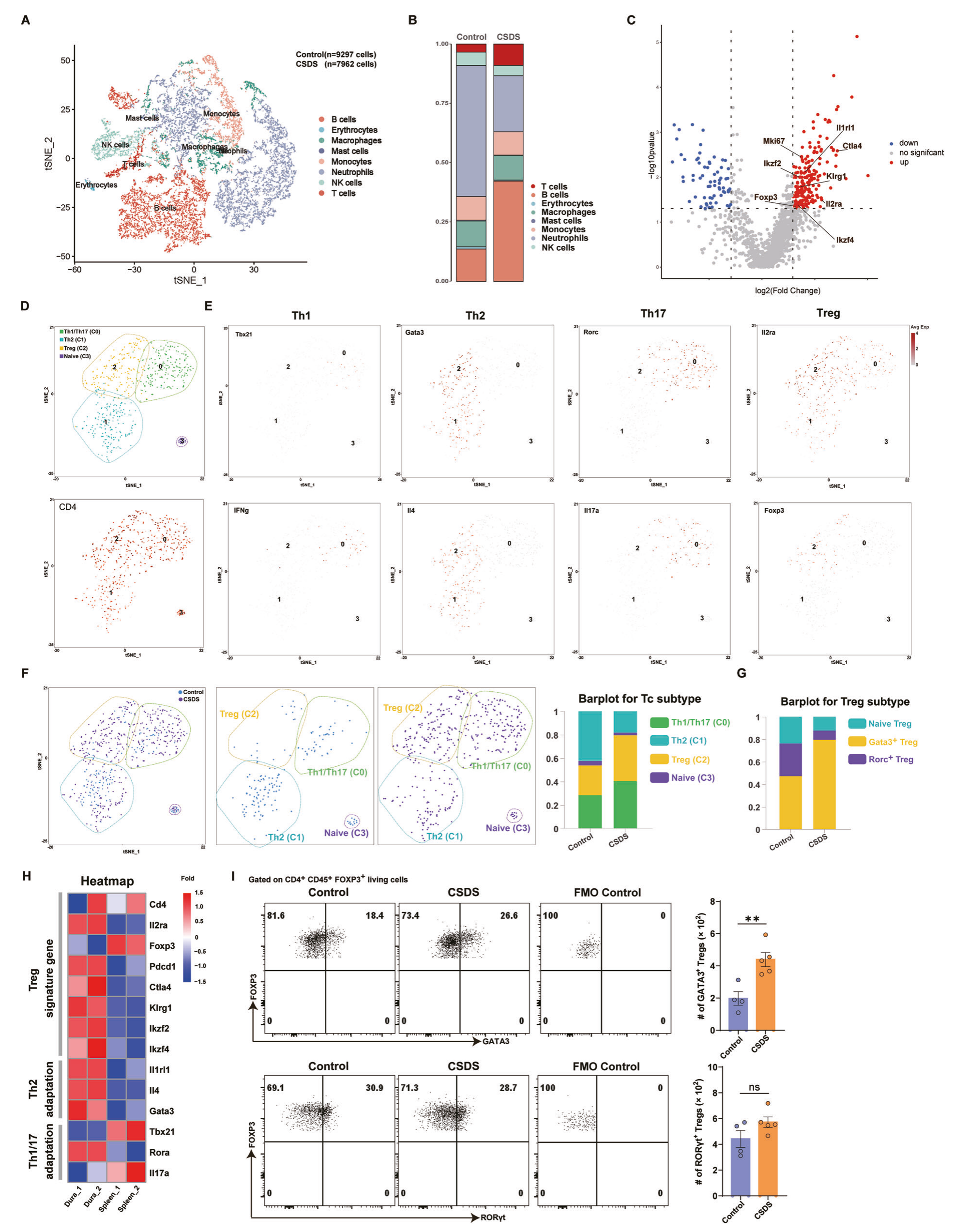CSDS小鼠和對照組小鼠硬腦膜分選得到的免疫細(xì)胞進行scRNA-seq,結(jié)果顯示CSDS小鼠硬腦膜T細(xì)胞占比增加,其中Treg和Th17比例增加,Th2比例降低,初始T細(xì)胞沒有發(fā)生變化;Treg中,Gata3+?Treg比例提高,初始Treg和Rorx+?Treg比例降低。對照組小鼠硬腦膜和脾臟分選得到Treg進行SMART-seq,發(fā)現(xiàn)與脾臟相比,硬腦膜Treg的Gata3+亞型和Rora+亞型相關(guān)基因表達(dá)上調(diào)。流式細(xì)胞術(shù)進一步證實CSDS小鼠硬腦膜中GATA3+?Treg顯著增加,RORγt+?Treg數(shù)量無顯著變化。這些表明GATA3+ Treg可能參與抑郁表現(xiàn)的調(diào)控。