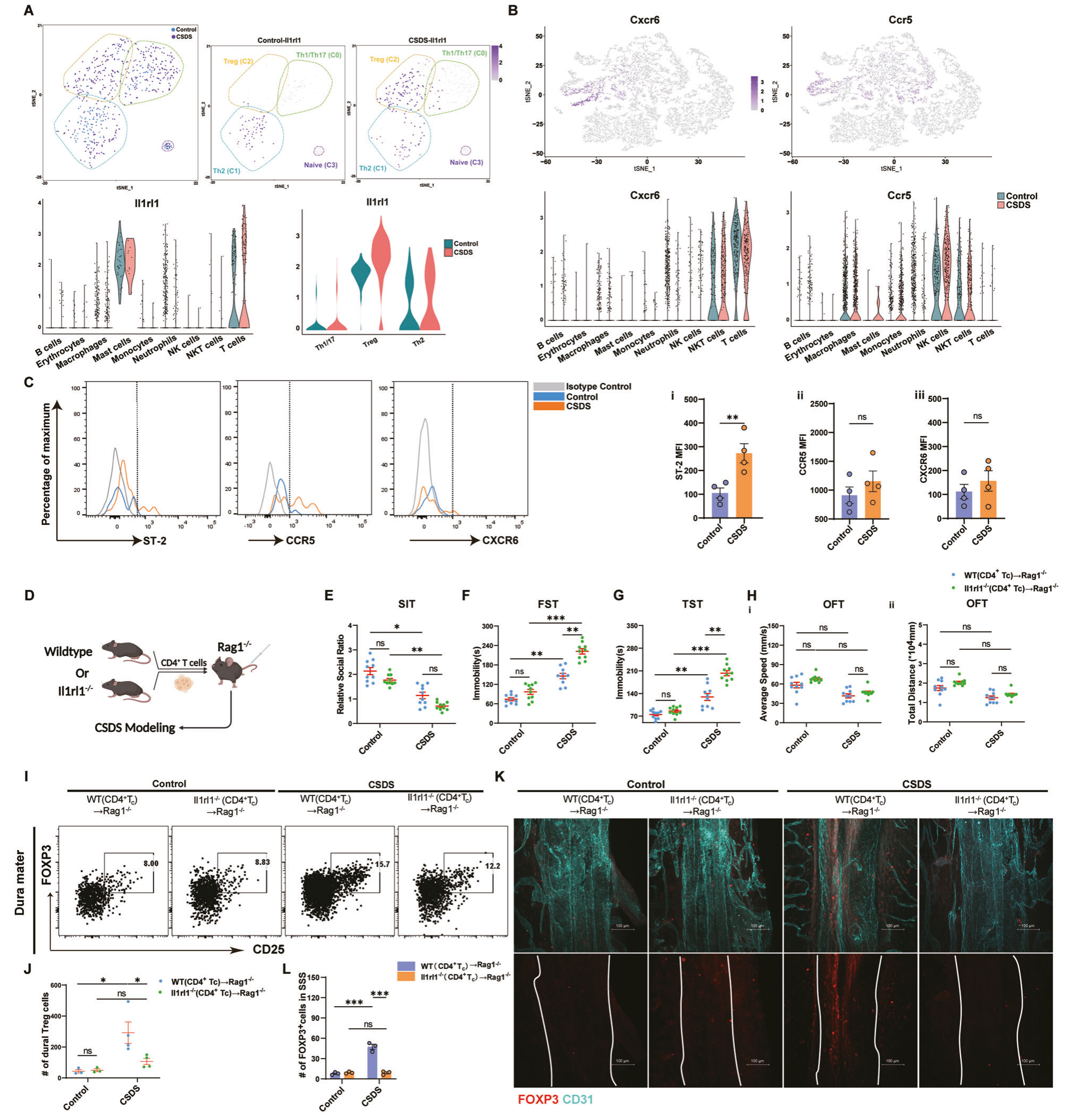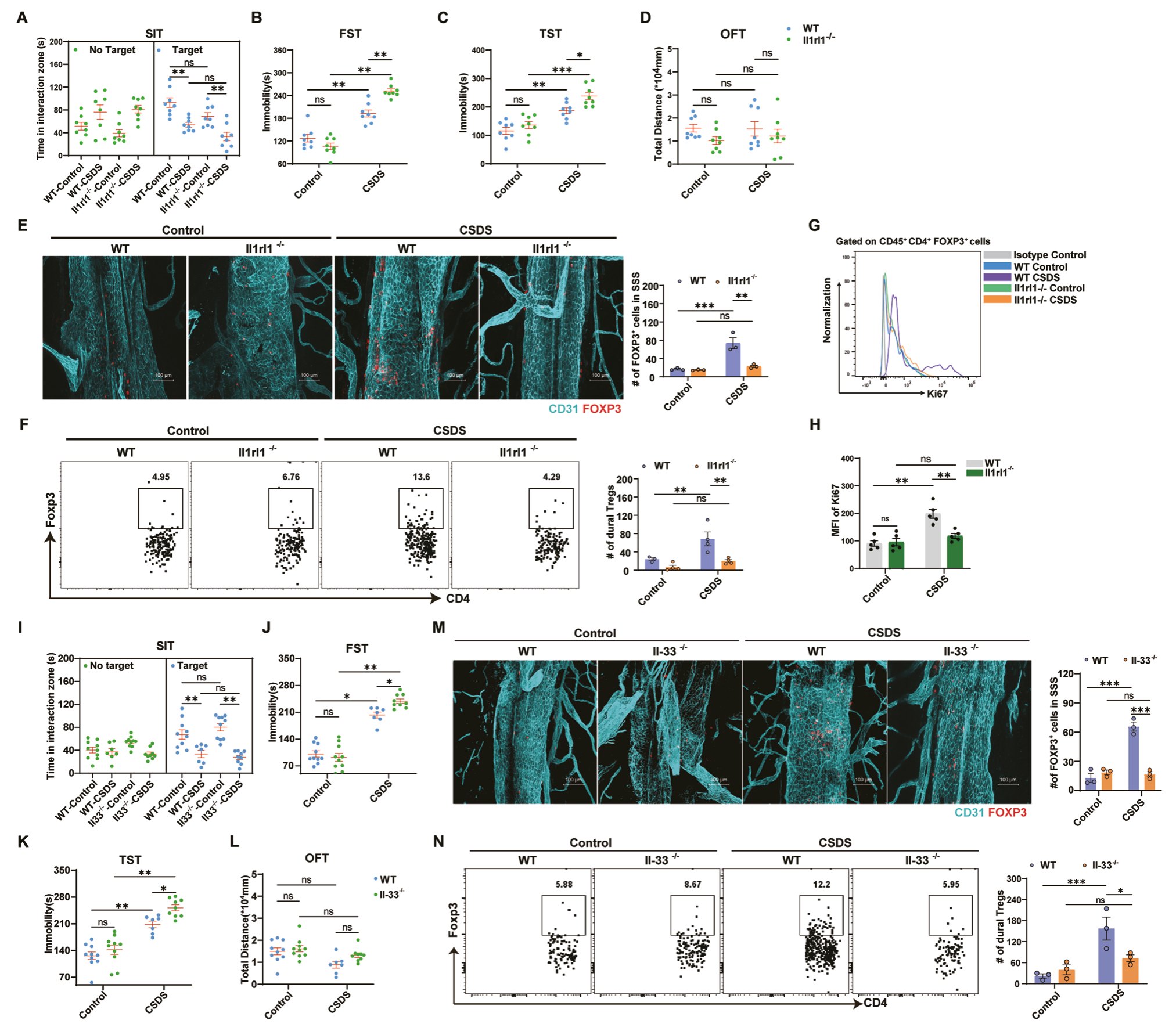 SMART-seq數(shù)據(jù)顯示CSDS小鼠硬腦膜“IL33結(jié)合”以及其他內(nèi)源性分子結(jié)合信號通路表達(dá)上調(diào);與脾臟相比,CSDS小鼠硬腦膜中表達(dá)ST2的細(xì)胞比例顯著高于脾臟;硬腦膜Treg富集趨化性通路。scRNA-seq數(shù)據(jù)也顯示CSDS小鼠模型中T淋巴細(xì)胞聚群高表達(dá)ST2編碼基因,且表達(dá)水平高于對照組小鼠的T淋巴細(xì)胞;CSDS小鼠模型硬腦膜Treg高表達(dá)ST2編碼基因。隨后,研究者將WT小鼠和Il1rl1-/-小鼠硬腦膜Treg細(xì)胞轉(zhuǎn)移到Rag1-/-小鼠并構(gòu)建CSDS模型,行為學(xué)等實驗結(jié)果證實,ST2表達(dá)是硬腦膜Treg招募和擴張所必須的。IL33-/-小鼠相關(guān)實驗也支持了IL33/ST2信號在抑郁期間促進硬腦膜Treg增殖。