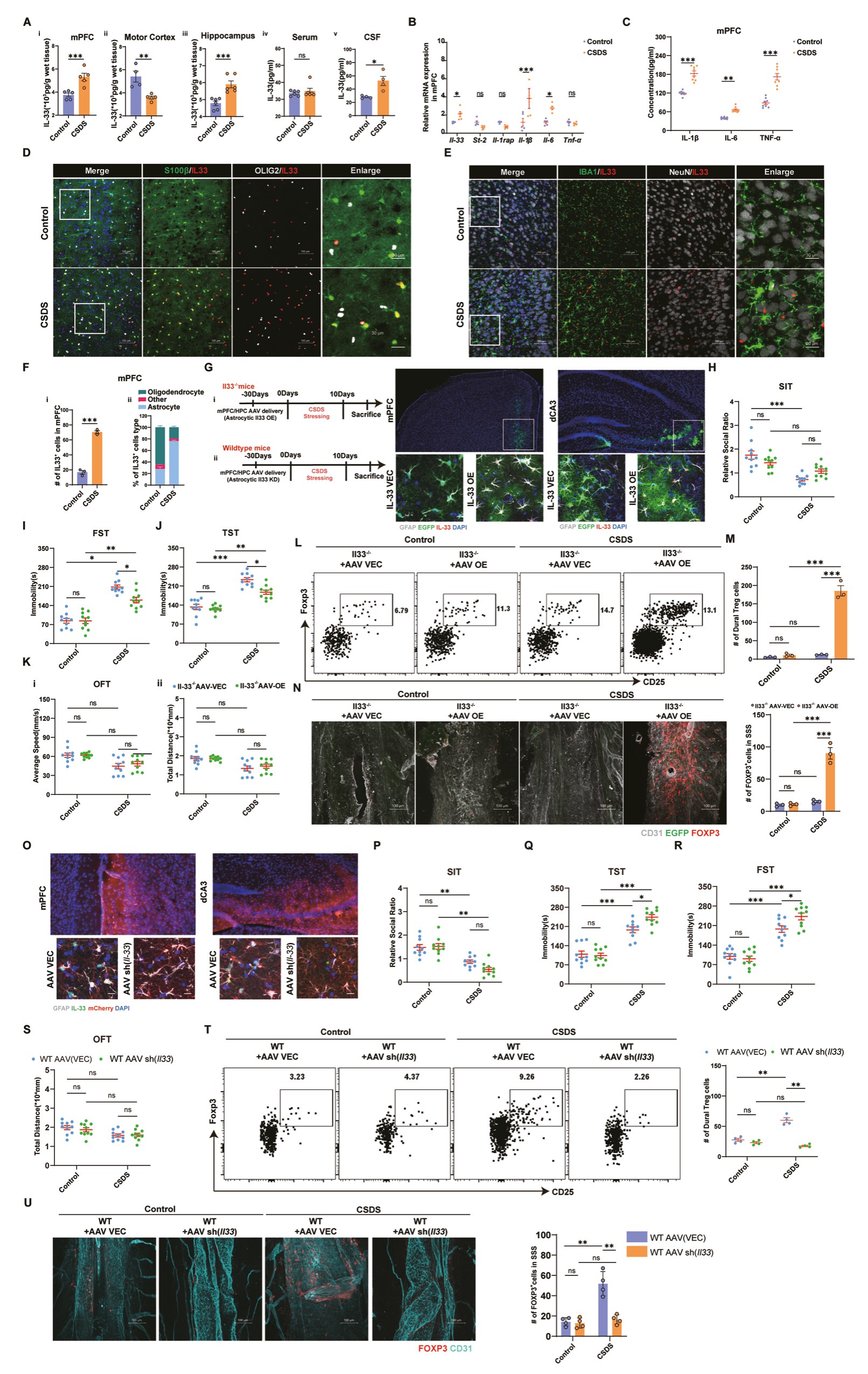 mPFC、海馬、腦脊液等組織的ELISA、qPCR以及Western blot實驗結(jié)果表明,CSDS小鼠硬腦膜ST2+ Treg激活所需的IL33來源于腦實質(zhì)而不是硬腦膜。多重免疫熒光結(jié)果表明mPFC處星形細(xì)胞是IL33增加的主要貢獻(xiàn)細(xì)胞類型。進一步的特異性細(xì)胞類型IL33基因表達(dá)KO-恢復(fù)實驗及相應(yīng)的行為學(xué)實驗、流式細(xì)胞術(shù)等結(jié)果表明,主要是星形細(xì)胞來源的IL33介導(dǎo)了CSDS小鼠中硬腦膜Treg的產(chǎn)生。