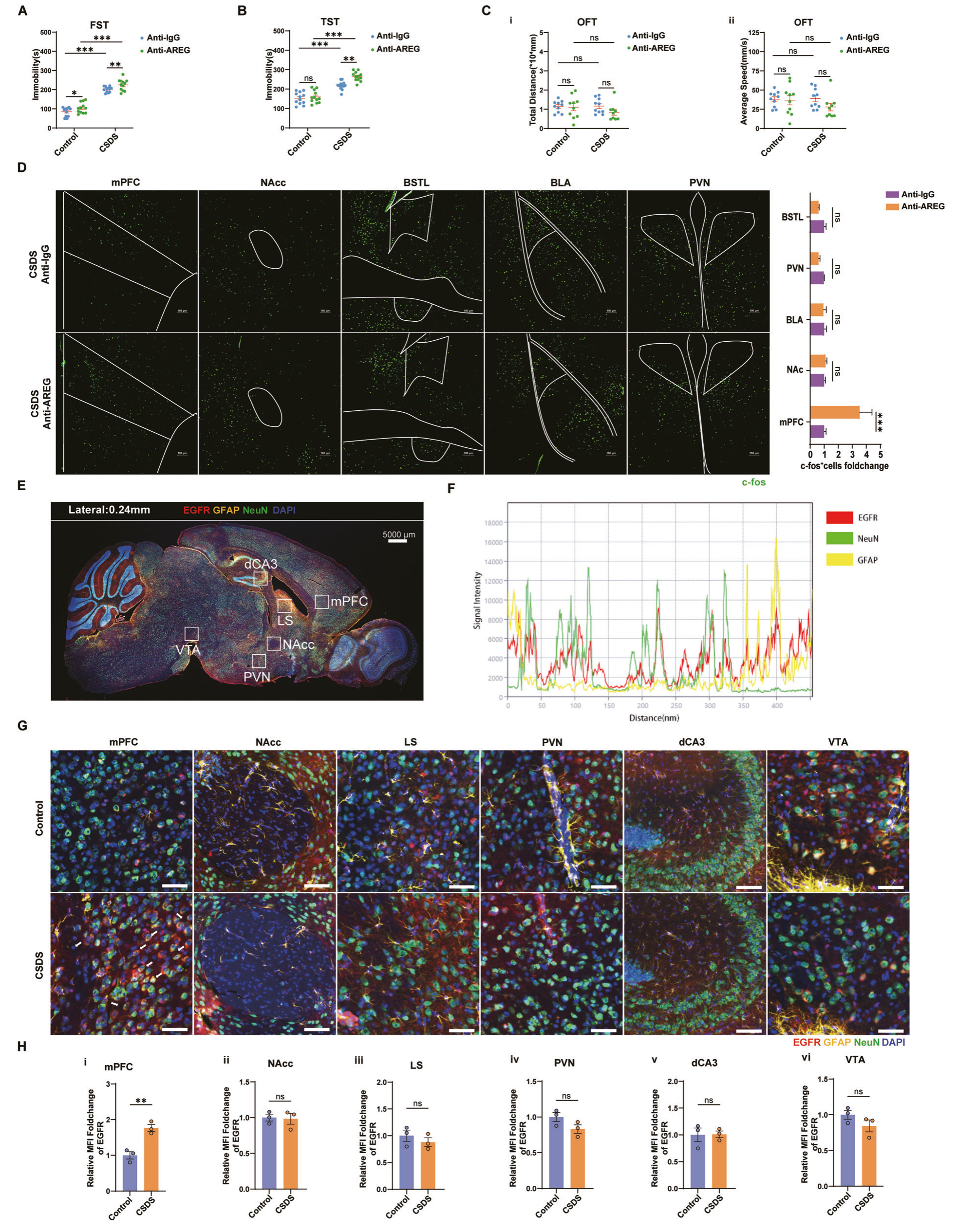 腦免疫熒光掃描結(jié)果表明硬腦膜來源的AREG可能特異性的影響mPFC神經(jīng)元活性,TSA多重染色等實驗結(jié)果表明,CSDS應(yīng)激顯著誘導(dǎo)mPFC神經(jīng)元EGFR(AREG是EGFR配體)的表達(dá),硬腦膜AREG去除可顯著抑制mPFC的EGFR激活,小腦延髓池注射的AREG中和抗體只去除了硬腦膜AREG但對mPFC腦區(qū)AREG無顯著影響。通過這些結(jié)果,研究者假設(shè)神經(jīng)元表達(dá)EGFR可以接收硬腦膜Treg來源的AREG,并激活EGFR信號,直接影響神經(jīng)元活性。