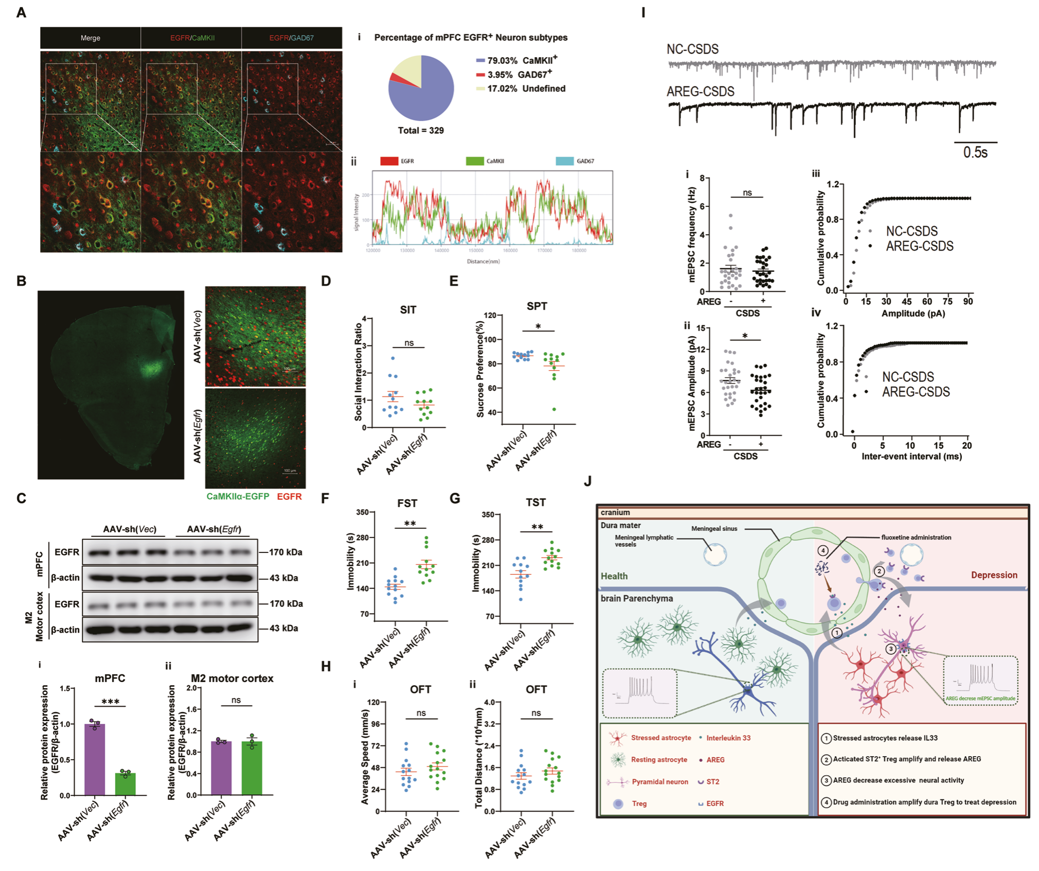 為了驗證這一假設(shè),研究者使用AAV抑制mPFC錐體神經(jīng)元EGFR的表達(dá),免疫熒光、Western blot等實驗結(jié)果表明,敲除EGFR部分地加重CSDS小鼠抑郁表現(xiàn),應(yīng)激誘導(dǎo)的抑郁中mPFC神經(jīng)元EGFR信號起到重要作用,揭示mPFC錐體神經(jīng)元是硬腦膜Treg來源AREG的靶細(xì)胞。