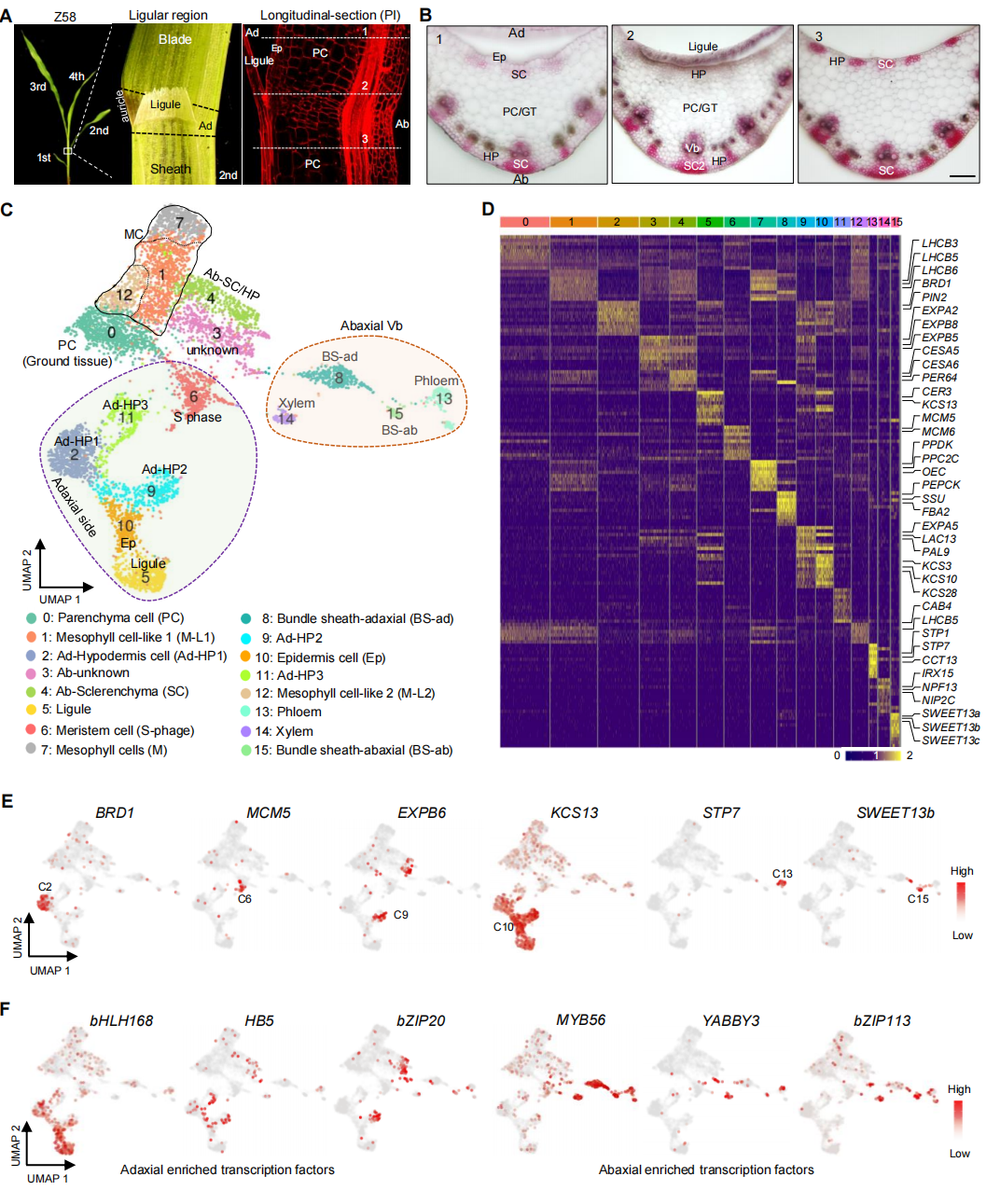 葉片角度(Leaf Angle, LA)是影響玉米種植密度和產(chǎn)量的關(guān)鍵因素。然而,調(diào)控葉片角度形成的機(jī)制尚不清楚。該研究通過對不同玉米自交系的莖葉枕區(qū)域進(jìn)行比較組織學(xué)分析,發(fā)現(xiàn)葉片角度大小顯著受到莖葉枕上表皮韌皮纖維細(xì)胞(SC)的初始伸長和隨后的木質(zhì)化的影響。通過批量和單細(xì)胞核RNA測序,生成了莖葉枕區(qū)域的全面轉(zhuǎn)錄組圖譜,并鑒定了許多可能影響其特化為SC的下皮細(xì)胞富集基因。