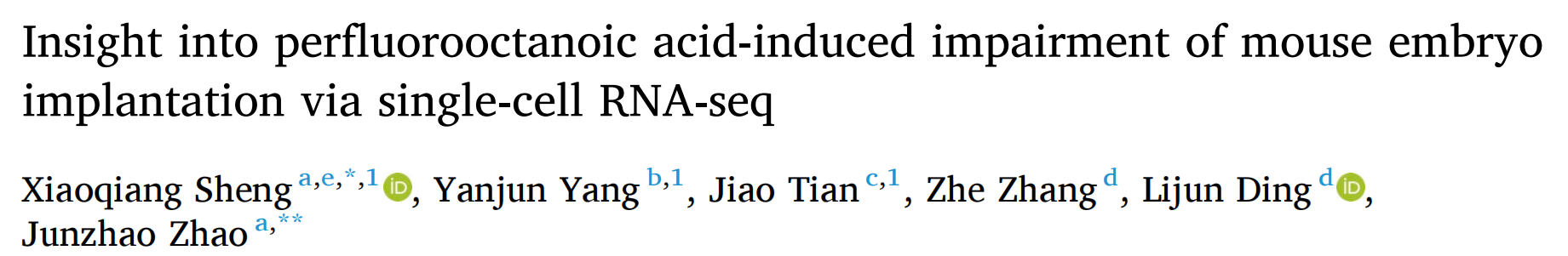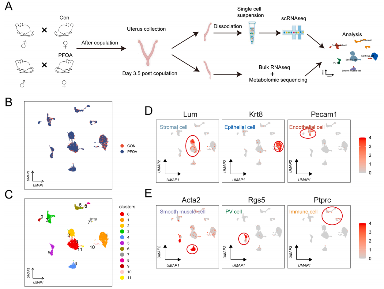 中文題目:單細(xì)胞RNA測序研究全氟辛酸誘導(dǎo)的小鼠胚胎著床損傷