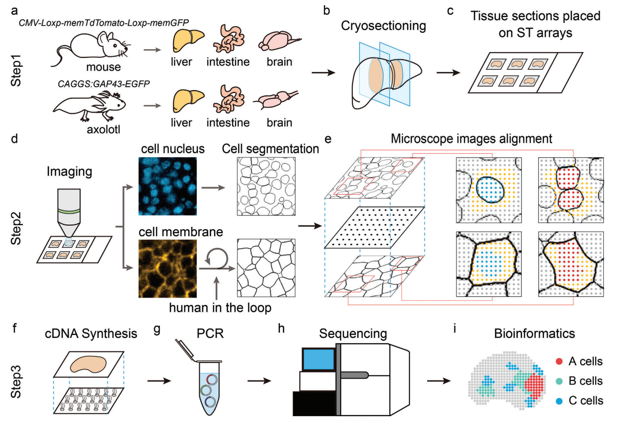 該研究提出了一種新的細(xì)胞邊界定義方法:利用基因編碼的熒光蛋白對細(xì)胞膜進(jìn)行標(biāo)記,從而能夠在組織切片上精確定位細(xì)胞內(nèi)的測序位點(diǎn)和轉(zhuǎn)錄本。與基于細(xì)胞核的方法相比,這種基于細(xì)胞膜的方法顯著增加了捕獲的基因數(shù)量,小鼠和墨西哥鈍口螈肝臟中基因數(shù)量分別增加了67%和119%。