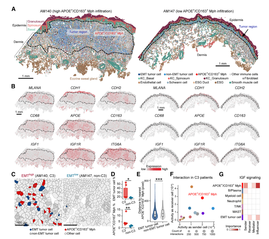 數(shù)據(jù)表明(與單細(xì)胞數(shù)據(jù)聯(lián)合分析)C3 亞型的 EMT 腫瘤細(xì)胞占比高,并且有 APOE+CD163+ 巨噬細(xì)胞的浸潤,巨噬細(xì)胞與 EMT 腫瘤細(xì)胞具有共定位特征。CellChat 互作分析驗(yàn)證了 APOE+CD163+ 巨噬細(xì)胞的高度受體配體互作,與單細(xì)胞轉(zhuǎn)錄組結(jié)果高度一致(APOE+/CD163+ 巨噬細(xì)胞是空間中 IGF 通路網(wǎng)絡(luò)的發(fā)送者(sender)和影響者(Influencer))。使用空間單細(xì)胞蛋白組學(xué)對患者腫瘤免疫微環(huán)境進(jìn)行了深入分析,結(jié)果顯示APOE+CD163+ TAM和EMThigh腫瘤細(xì)胞存在高度相關(guān)的定位,這與空間轉(zhuǎn)錄組的結(jié)果一致。