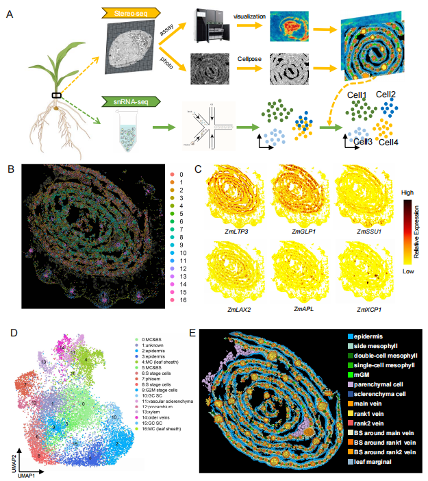 ③ 該研究描繪了從發(fā)展中的玉米原基尖端向下的潛在維管束鞘細胞亞群和不同層次的葉肉細胞。