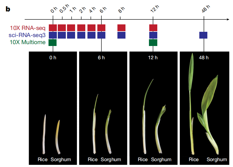 單細胞核轉(zhuǎn)錄組:水稻和高粱幼苗暗生長5天后,在光周期(12h光/12h暗)中采集0h(暗)、0.5h、1h、2h、4h、6h、8h、12h、48h共9個時間點的地上組織??傆嬎?90,569個核、高粱265,701個核。