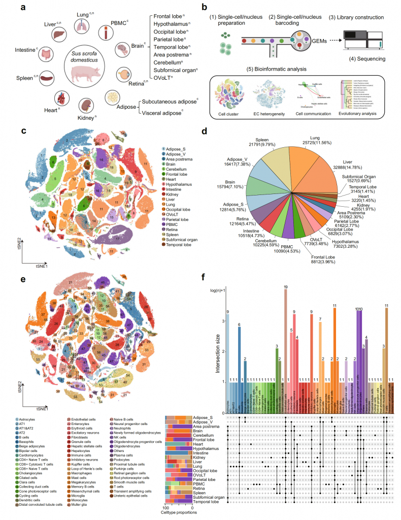 ① 使用單細(xì)胞轉(zhuǎn)錄組測序及單細(xì)胞核轉(zhuǎn)錄組測序,構(gòu)建首個(gè)家豬多器官單細(xì)胞圖譜,得到234種降維聚類簇,鑒定出58種細(xì)胞類型及其相關(guān)的顯著富集標(biāo)志基因,搭建了可視化家豬單細(xì)胞轉(zhuǎn)錄組數(shù)據(jù)庫(Pig Single Cell Atlas Database)。