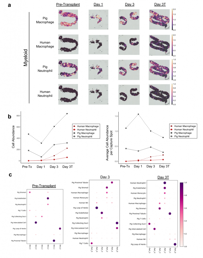 ② 移植后豬腎中髓系細(xì)胞是人和豬腎中檢測到的最多的免疫細(xì)胞,移植3天內(nèi)人B細(xì)胞和T淋巴細(xì)胞很少檢測到,3天后檢測到的人免疫細(xì)胞增多但豐度遠(yuǎn)小于豬免疫細(xì)胞。
