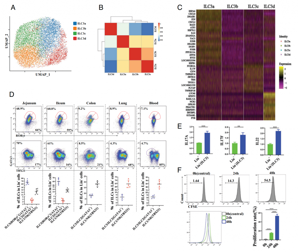 ② 豬空腸ILC標(biāo)志基因與人基因相似,包括IL-23R、AHR、NCR2等。此外,研究者發(fā)現(xiàn)ILC3可能分化成ILC2、ILC1和NK細(xì)胞。ILC3亞群種,ILC3b沒有明顯高表達(dá)基因,是ILC亞群中具有更高轉(zhuǎn)分化可塑性的亞群,IKZF1和TGFB1可能與該過程有關(guān)。