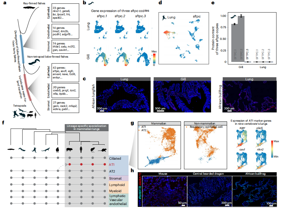 ③ 全基因組復(fù)制對肺演化很重要,1866個(gè)肺相關(guān)直系同源基因中有776個(gè)是脊椎動(dòng)物兩輪全基因組復(fù)制(2R-WGD)的產(chǎn)物;哺乳動(dòng)物譜系特異的基因復(fù)制也十分重要,sfta2-/-小鼠表現(xiàn)出明顯的呼吸疾病,包括顯著的炎癥。