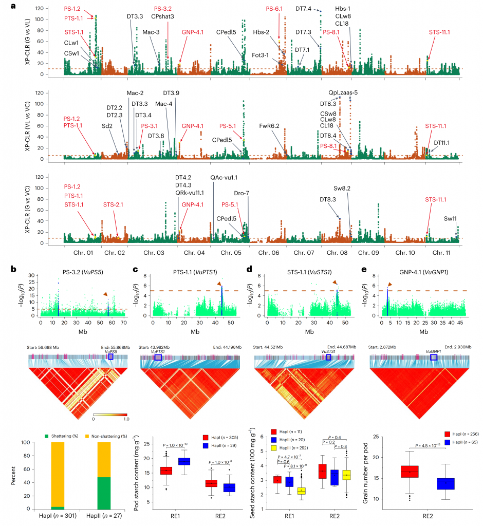 為了研究自然或人工選擇對(duì)豇豆分化的影響,作者通過(guò)選擇清除分析比較了三個(gè)豇豆亞群之間的基因組選擇特征,鑒定出239個(gè)與豇豆馴化和改良相關(guān)的基因。此外,通過(guò)GWAS,挖掘到裂莢性、莢長(zhǎng)、單莢粒數(shù)、千粒重、可溶性糖、總淀粉和粗蛋白質(zhì)含量相關(guān)基因,并在遺傳群體中驗(yàn)證。同時(shí)揭示了兩個(gè)亞種之間基因組結(jié)構(gòu)變異(SVs)的全圖譜,為豇豆在全基因組選擇下的馴化與改良提供了見(jiàn)解。產(chǎn)量性狀和品質(zhì)性狀的差異基因組選擇將有助于建立糧用豇豆和菜用豇豆雙向改良的遺傳資源。