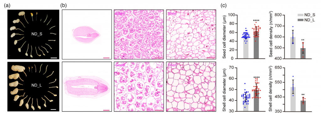 實(shí)驗(yàn)方法:莢果大小/重量差異顯著2份Virginia-type花生材料( ND _ L和ND _ S)雜交,產(chǎn)生遺傳群體;F2:3群體BSA-seq(20+20混池);F6:7 和F6:8群體精細(xì)定位;基因克?。幌到y(tǒng)進(jìn)化分析;亞細(xì)胞定位;免疫熒光;酵母雙雜交;pull-down;CO-IP;番茄擬南芥轉(zhuǎn)化實(shí)驗(yàn)等。