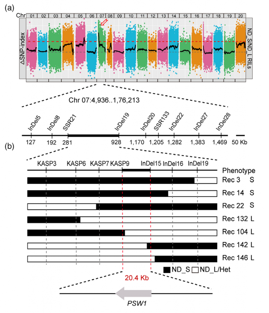 花生莢果大小是決定花生產(chǎn)量的關(guān)鍵農(nóng)藝性狀,為了鑒定控制花生莢果大小的基因,該研究對(duì)188份核心種質(zhì)進(jìn)行鑒定,并選取莢果大小/重量差異顯著的2份花生材料構(gòu)建F2群體,BSA-Seq獲得了288.58 Gb的原始數(shù)據(jù)。利用285914個(gè)高質(zhì)量SNPs 和70 759個(gè) InDel,將控制莢果大小的基因定位在07染色體1.17 Mb的區(qū)間內(nèi)。作者從F6:7和F6:8群體中開(kāi)發(fā)了15個(gè)多態(tài)性標(biāo)記并對(duì)個(gè)體進(jìn)行基因分型,精細(xì)定位QTL到KASP 9 和In Del15之間20.4 kb的區(qū)間內(nèi)。該區(qū)間僅包含1個(gè)預(yù)測(cè)的非同義突變基因和InDels,將該基因命名為PSW1。