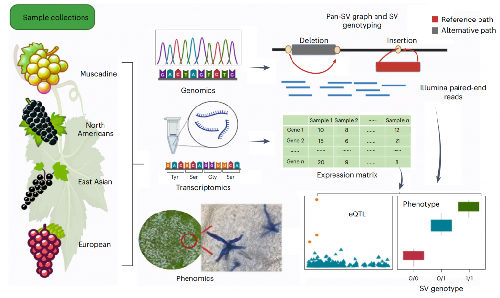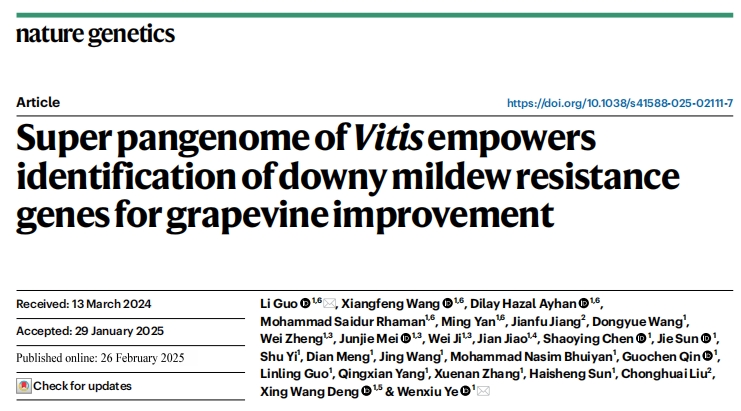 2025年02月26日,濰坊現(xiàn)代農(nóng)業(yè)山東省實(shí)驗(yàn)室、北京大學(xué)現(xiàn)代農(nóng)業(yè)研究院葉文秀研究員和郭立研究員團(tuán)隊(duì)在國際期刊《自然-遺傳學(xué)(Nature Genetics)》上在線發(fā)表了題為Super pangenome of Vitis?empowers identification of downy mildew resistance genes for grapevine improvement的研究成果。作為葡萄科研領(lǐng)域里程碑式的重大突破,繪制了涵蓋葡萄屬的歐亞、北美和東亞世界三大種群的72個(gè)葡萄種質(zhì)材料的單倍型超級(jí)泛基因組圖譜,揭示葡萄屬豐富遺傳多樣性和雜交歷史,基于葡萄多組學(xué)數(shù)據(jù),挖掘到葡萄霜霉病抗性相關(guān)遺傳變異和抗病基因,加速葡萄精準(zhǔn)分子育種,開啟葡萄種質(zhì)創(chuàng)新和利用新時(shí)代。百邁客生物為該研究提供了基因組、hic、轉(zhuǎn)錄組等測(cè)序服務(wù)。
