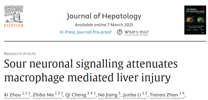 2025年3月,華中科技大學(xué)同濟(jì)醫(yī)學(xué)院附屬同濟(jì)醫(yī)院器官移植研究所蘭培祥教授、陳知水教授和肝臟外科程琪教授研究團(tuán)隊(duì)在Journal of Hepatology發(fā)表題為”Sour Neuronal Signalling Attenuates Macrophage Mediated Liver Injury”的研究論文。研究使用單細(xì)胞轉(zhuǎn)錄組測序技術(shù)等多種技術(shù),深入闡述人鼠中減輕肝缺血再灌注損傷的腦-肝軸調(diào)控通路,發(fā)現(xiàn)酸味刺激竟然可以通過神經(jīng)信號緩解肝臟損傷!這一發(fā)現(xiàn)不僅為肝臟疾病的治療提供了新思路,還從現(xiàn)代科學(xué)的角度驗(yàn)證了中醫(yī)“酸入肝”的理論。