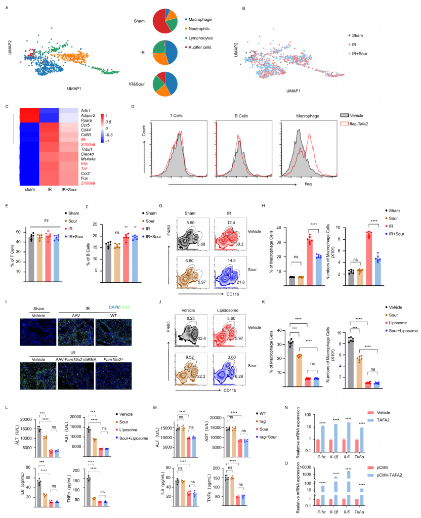 體外實(shí)驗(yàn)發(fā)現(xiàn)TAFA2不引起肝細(xì)胞凋亡;snRNA-seq數(shù)據(jù)顯示IRI肝中巨噬細(xì)胞比例增加且炎癥相關(guān)基因表達(dá)水平增加,但在酸刺激組中降低;流式細(xì)胞術(shù)實(shí)驗(yàn)結(jié)果表明,TAFA2與巨噬細(xì)胞結(jié)合而不與T/B細(xì)胞結(jié)合,不論是否酸刺激T/B細(xì)胞比例無顯著變化,IRI肝中CD11b+F4/80low?巨噬細(xì)胞增加而酸刺激可降低該巨噬細(xì)胞數(shù)量;TAFA2敲除或敲低抑制IRI肝中巨噬細(xì)胞的浸潤,這些結(jié)果表明TAFA2促進(jìn)巨噬細(xì)胞活化。體外實(shí)驗(yàn)結(jié)果表明,TAFA2可以激活BMDM(骨髓來源巨噬細(xì)胞),引起Il1α,Il1β,Il6和Tnfα的表達(dá),這些結(jié)果表明TAFA2激活的巨噬細(xì)胞介導(dǎo)了肝IRI。