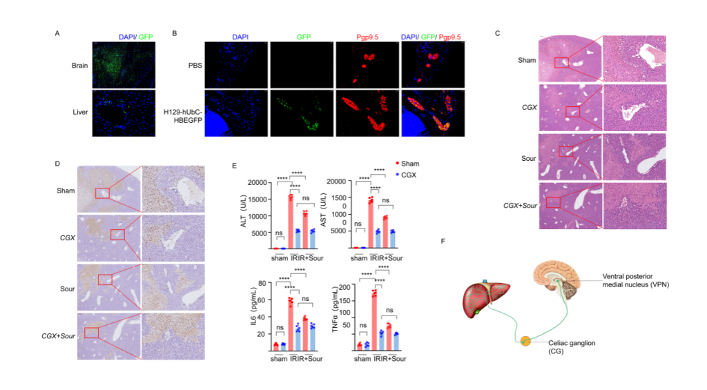 研究者首先構(gòu)建酸刺激下肝臟缺血再灌注損傷(IRI)小鼠模型,發(fā)現(xiàn)酸刺激可以減少肝組織損傷以及血清標(biāo)志物水平。但是,使用丁卡因局麻小鼠舌頭或者灌胃檸檬酸不能減少肝損傷和血清標(biāo)志物水平;NMDAR阻斷劑1(阻斷NMDAR介導(dǎo)的興奮性突觸傳遞)立體定位注射到腹后內(nèi)側(cè)核(VPN)后,酸刺激后IRI肝的血清標(biāo)志物水平和肝損傷程度無明顯變化,表明神經(jīng)系統(tǒng)在酸刺激減輕IRI過程中起重要作用。此外,小鼠VPN注射示蹤病毒的實(shí)驗(yàn)結(jié)果顯示,肝臟以及CG(腹腔神經(jīng)節(jié))均檢測到熒光,行腹腔神經(jīng)節(jié)切除術(shù)能降低IRI肝的組織損傷和血清標(biāo)志物水平,表明酸刺激減輕肝損傷過程通過腦-CG-肝軸。