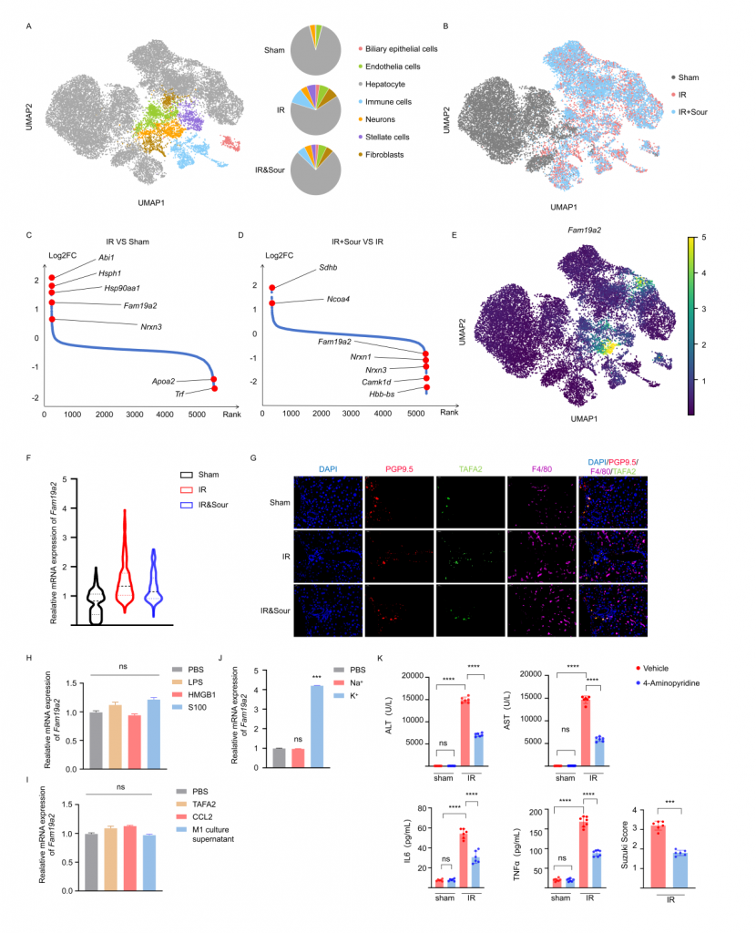 對肝IRI小鼠、酸刺激后肝IRI小鼠及sham(假手術(shù))小鼠的肝臟和CG進(jìn)行單細(xì)胞核轉(zhuǎn)錄組測序,結(jié)果顯示IRI引起肝細(xì)胞和神經(jīng)元基因表達(dá)譜發(fā)生變化,IRI肝中免疫細(xì)胞數(shù)量增加,但酸刺激后IRI樣本中免疫細(xì)胞數(shù)量減少。神經(jīng)元較為特異性地表達(dá)TAFA2,IRI可引起肝神經(jīng)元TAFA2表達(dá)水平增加,但酸刺激使得TAFA2表達(dá)水平降到與sham對照組相近水平。實(shí)驗(yàn)發(fā)現(xiàn)鉀離子可引起小鼠海馬神經(jīng)元細(xì)胞系HT22顯著高表達(dá)TAFA2,使用鉀離子通道抑制劑可減輕肝損傷,支持酸刺激通過神經(jīng)系統(tǒng)減輕肝損傷的假設(shè)。進(jìn)一步的,使用慢病毒敲低神經(jīng)元TAFA2表達(dá)水平或使用TAFA2敲基因鼠,發(fā)現(xiàn)IRI引起的肝組織損傷、巨噬細(xì)胞浸潤以及血清標(biāo)志物水平降低,表明TAFA2在肝IRI中有著重要作用。