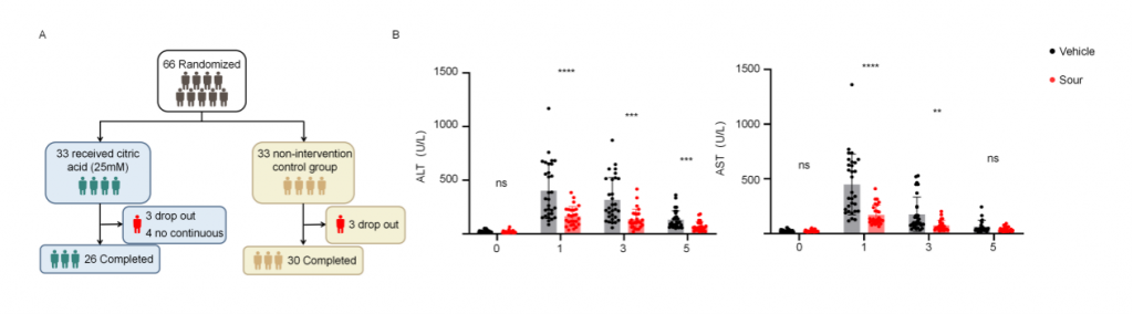 為了確認(rèn)酸刺激在人類肝IRI中的作用,研究者進(jìn)行了開放、隨機(jī)、空白對照臨床試驗(yàn)(ChiCTR2400088096),包含多種良性/惡性肝腫瘤、肝外傷、膿腫、囊腫和包蟲病,由于手術(shù)期間門靜脈短暫阻斷以減少肝切除過程中出血,導(dǎo)致肝出現(xiàn)缺血再灌注損傷。干預(yù)組33名患者,術(shù)前24h開始,每8h給與新鮮的25mM檸檬酸(持續(xù)5min),對照組33名患者不接受酸刺激,剔除6名術(shù)中肝缺血超過30min患者以及4名依從性差患者,肝切除術(shù)后第1/3/5天對患者肝功能進(jìn)行評估,結(jié)果顯示酸刺激組血清ALT和AST水平顯著低于對照組,高ALT水平(>500 U/L)患者數(shù)量也顯著更低,這些結(jié)果表明酸刺激可減輕人類肝切除術(shù)引起的肝IRI。