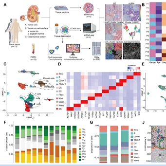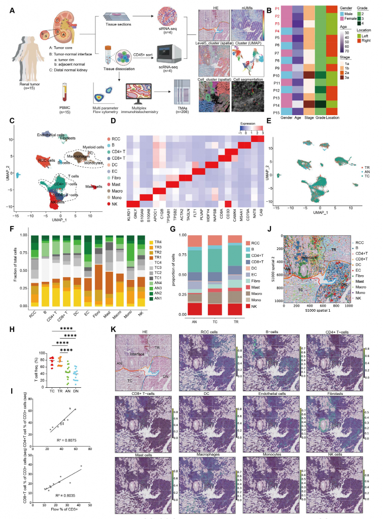 組別設(shè)計:實驗組4名ccRCC患者樣本進(jìn)行單細(xì)胞轉(zhuǎn)錄組測序&空間轉(zhuǎn)錄組測序,驗證組15名ccRCC患者樣本進(jìn)行流式細(xì)胞術(shù)&多重免疫熒光染色,151名ccRCC患者組織樣本&40名其他腎癌亞型患者組織樣本&6名捐獻(xiàn)者健康腎組織進(jìn)行多重?zé)晒饷庖呓M化染色。