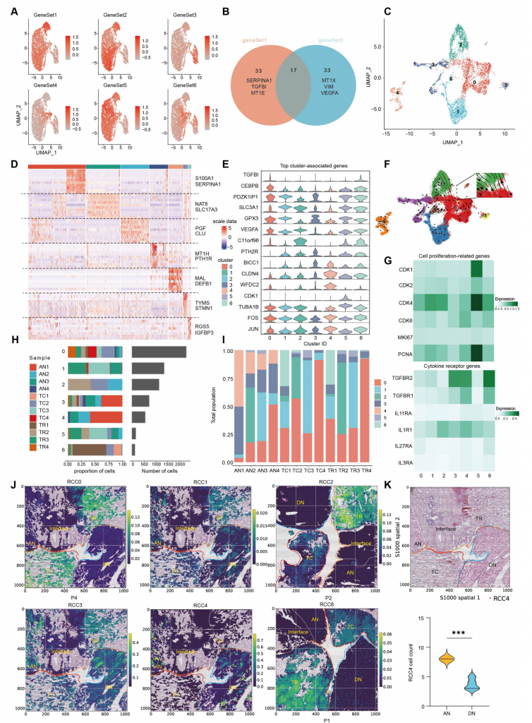 進(jìn)一步分析,發(fā)現(xiàn)ccRCC亞群0~4簇與不同基因集表達(dá)譜匹配,5和6簇不與任何基因集匹配但具有細(xì)胞周期和應(yīng)激響應(yīng)相關(guān)基因表達(dá)。RCC0簇和RCC2簇代表EMThigh腫瘤細(xì)胞并在IF區(qū)域富集,RCC1簇代表PT(近曲小管)細(xì)胞,擬時序分析結(jié)果顯示存在RCC0—>RCC2分化關(guān)系,但RCC2幾乎只在P2患者樣本中發(fā)現(xiàn),表明RCC2可能與個別患者特征相關(guān)。RCC1、RCC3和RCC4細(xì)胞主要在組織而不是腫瘤區(qū)域富集,RCC4主要分布在AN和DN區(qū)域,RCC4在AN區(qū)域分布數(shù)量高于DN區(qū)域。RCC4高表達(dá)細(xì)胞因子受體基因,表明TME中分泌的促腫瘤細(xì)胞因子可能傾向于作用到RCC4,增加其轉(zhuǎn)變成癌細(xì)胞的概率,加速腫瘤逃逸,促進(jìn)腫瘤惡性化,與以往瘤旁附近不是完全的健康組織認(rèn)識相符合。