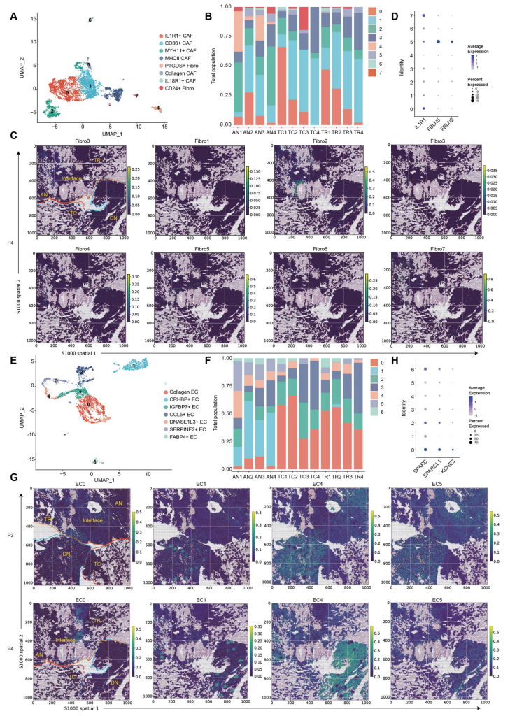 scRNA-seq與空間數(shù)據(jù)均顯示,ccRCC存在8種激活的成纖維細(xì)胞簇,腫瘤區(qū)域成纖維細(xì)胞數(shù)量高于健康組織,其中CD24+IL32+成纖維細(xì)胞顯著富集在腫瘤區(qū)域,PTGDS+成纖維細(xì)胞幾乎全分布在AN,高表達(dá)ECM(胞外基質(zhì))形成和EMT的成纖維細(xì)胞簇在IF較為富集,IL1R1+?CAF(腫瘤相關(guān)成纖維細(xì)胞)表現(xiàn)出腫瘤促進(jìn)表型;7種EC(內(nèi)皮細(xì)胞)簇中4種(0,2,3和6)主要富集在腫瘤組織,3種(1,4和5)在健康組織富集,膠原蛋白EC(0簇)豐度最高,具有促腫瘤特征。總之,不同的ECM蛋白質(zhì)產(chǎn)生基質(zhì)細(xì)胞傾向于富集在IF并共定位,可能行駛多種功能,包括細(xì)胞-細(xì)胞交互和胞外組分重構(gòu)。