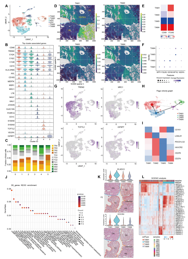 scRNA-seq數(shù)據(jù)與空間數(shù)據(jù)均顯示,4種TAM簇具有不同分布趨勢,TAM1主要分布在TC區(qū)域;TAM2高表達(dá)FOLR2、MRC1和CD163,可能是M2樣巨噬細(xì)胞且具有增強(qiáng)的免疫抑制特征,TAM4是組織駐留巨噬細(xì)胞,兩者主要分布在TR區(qū)域;TAM3表達(dá)炎癥響應(yīng)相關(guān)基因,在TR和AN區(qū)域富集。RNA速率分析顯示存在TAM4—>TAM2—>TAM1和TAM4—>TAM3兩種軌跡,以及從IF區(qū)域遷移到TC區(qū)域的趨勢。進(jìn)一步的功能分析顯示,IF區(qū)域的TAM2可能通過促進(jìn)EMT,TC區(qū)域的TAM2可能通過促進(jìn)腫瘤血管生成,起到促癌效應(yīng)??傊?strong>TAM2不同的腫瘤促進(jìn)效應(yīng)可能與免疫抑制TME有關(guān)。