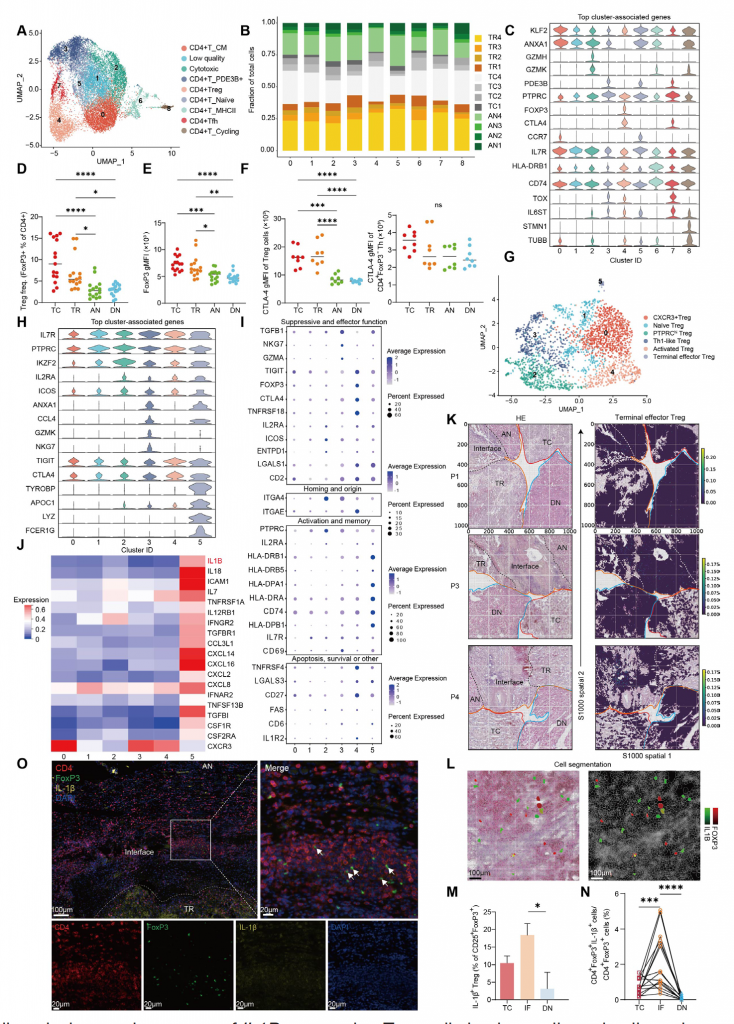 進(jìn)一步分析CD4+ T細(xì)胞簇,發(fā)現(xiàn)存在CD4+ 初始T細(xì)胞、Treg和濾泡樣輔助T細(xì)胞,不同簇的特征基因和空間分布模式不同,IF區(qū)域富集CD4+ 初始T細(xì)胞和PDE3B+ CD4+ T細(xì)胞,腫瘤區(qū)域富集Treg。其中,TC/TR區(qū)域CTLA-4+?Treg的占比以及Treg的FoxP3蛋白表達(dá)水平高于AN/DN區(qū)域,而CTLA-4+FoxP3-?Treg在所有組織中的分布較為均勻,表明腫瘤區(qū)域Treg細(xì)胞具有更強(qiáng)的免疫抑制功能。