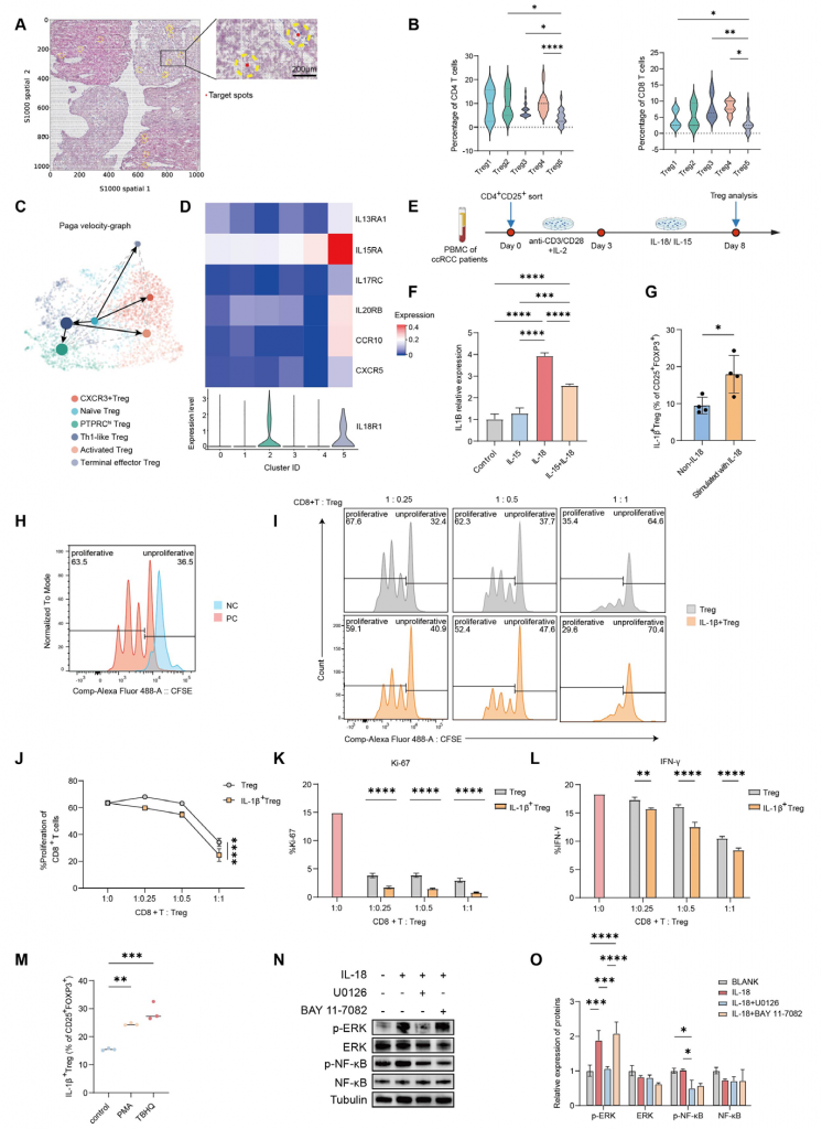 空間轉(zhuǎn)錄組數(shù)據(jù)結(jié)果顯示不同Treg細(xì)胞100μm范圍內(nèi)激活的CD4+/CD8+ T細(xì)胞數(shù)量較少,終末效應(yīng)Treg細(xì)胞100μm范圍內(nèi)CD4+/CD8+ T細(xì)胞數(shù)量更少,表明終末效應(yīng)Treg細(xì)胞周圍應(yīng)答Treg細(xì)胞(Tresp)增殖受到更強(qiáng)的抑制。細(xì)胞共培養(yǎng)實驗表明終末效應(yīng)Treg細(xì)胞具有強(qiáng)免疫抑制功能。RNA速率分析結(jié)果表明效應(yīng)終末Treg可能由初始Treg細(xì)胞分化而來,體外實驗表明IL-18可刺激CD4+CD25+ Treg細(xì)胞上調(diào)IL-1β表達(dá),表明終末效應(yīng)Treg細(xì)胞產(chǎn)生和作用可能與IL-18有關(guān)。ERK激活劑/NF-κB激活劑促進(jìn)IL-18+ Treg細(xì)胞的產(chǎn)生,IL-18處理后Treg細(xì)胞ERK/NF-κB磷酸化水平增加,ERK抑制劑可抑制Treg細(xì)胞表達(dá)NF-κB但NF-κB抑制劑無法抑制ERK表達(dá),綜上,這些結(jié)果表明IL-18可能通過ERK/NF-κB通路介導(dǎo)終末效應(yīng)Treg細(xì)胞的產(chǎn)生。