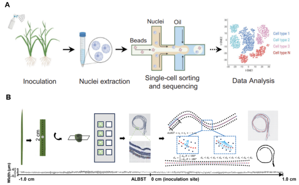 單細(xì)胞組學(xué)和時(shí)空組學(xué)是近年來(lái)生命科學(xué)領(lǐng)域的重要技術(shù)突破,它們?cè)诩?xì)胞異質(zhì)性解析、動(dòng)態(tài)過(guò)程研究和細(xì)胞間相互作用分析方面具有重要優(yōu)勢(shì),為生命科學(xué)研究帶來(lái)了全新的視角和深度。水稻稻瘟病是世界上發(fā)生嚴(yán)重的真菌病害之一,水稻在面臨稻瘟菌侵染時(shí)會(huì)激活動(dòng)態(tài)免疫,因此挖掘水稻特異免疫基因?qū)τ诳沟疚敛【秩局陵P(guān)重要。