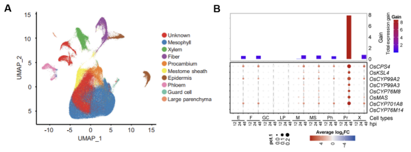 對(duì)測(cè)序獲得的單細(xì)胞數(shù)據(jù),結(jié)合細(xì)胞特異的標(biāo)志基因,AddModuleScore?軟件和GO富集分析等方法,對(duì)水稻的細(xì)胞類(lèi)型進(jìn)行了分類(lèi)注釋(圖2A)?;虮磉_(dá)分析發(fā)現(xiàn),維管細(xì)胞中的原形成層細(xì)胞在稻瘟菌侵染后高度誘導(dǎo)二萜類(lèi)植保素合成代謝相關(guān)基因的表達(dá),其中水稻關(guān)鍵植保素momilactone A合成被特異誘導(dǎo)(圖2B),促進(jìn)了momilactone A在維管組織中積累,可能是抗稻瘟病的關(guān)鍵因素。相反,激素途徑和模式分子激發(fā)的免疫對(duì)抗病性貢獻(xiàn)較弱。