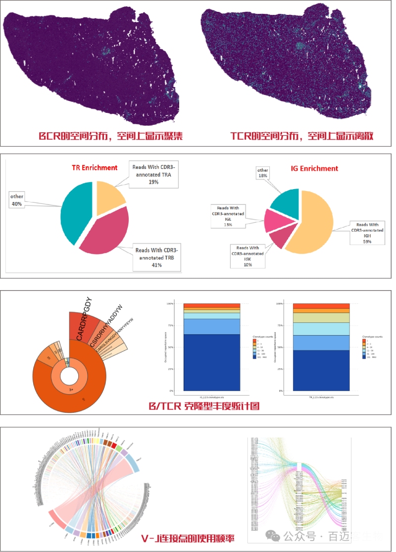 腫瘤樣本我們可以類比為一處具有復(fù)雜地貌的特殊地理環(huán)境,不同的環(huán)境造就了各種細(xì)胞的不同狀態(tài),而T/B細(xì)胞在不同的“選擇壓力”下邊進行了不同的“適應(yīng)性進化”。對不同生態(tài)位的T/B細(xì)胞尤其是TCR/BCR進行測定,有助于我們?nèi)ソ沂久庖呒?xì)胞的克隆起源和進化過程。例如,通過分析TCR的VDJ重排,可以追蹤T細(xì)胞克隆的起源和擴增過程。這種分析有助于理解免疫細(xì)胞在不同生理和病理狀態(tài)下的動態(tài)變化。