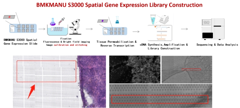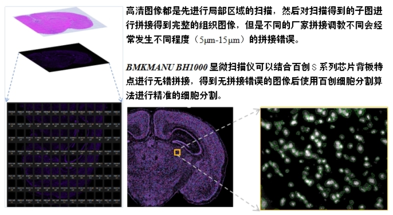 可以利用BH1000對明場及熒光掃描過程中經(jīng)常出現(xiàn)的拼接錯(cuò)誤進(jìn)行校準(zhǔn)(自主研發(fā)BMCHiper軟件,搭配自研半透半返模塊,實(shí)現(xiàn)圖像無錯(cuò)校準(zhǔn)),得到原片無錯(cuò)高清的熒光圖像與原片無錯(cuò)高清的明場圖像,為后續(xù)空間數(shù)據(jù)準(zhǔn)確的定位和可視化提供基礎(chǔ),使得復(fù)雜的轉(zhuǎn)錄組數(shù)據(jù)能夠轉(zhuǎn)化為最直觀,最精準(zhǔn)的生物學(xué)見解。