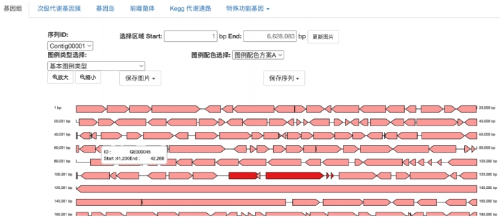 云平臺(tái)內(nèi)置【基因組圖譜展示工具】,點(diǎn)擊即可查看基因組環(huán)形圖、基因位置分布等信息,直觀掌握基因組結(jié)構(gòu)(示意圖如下)