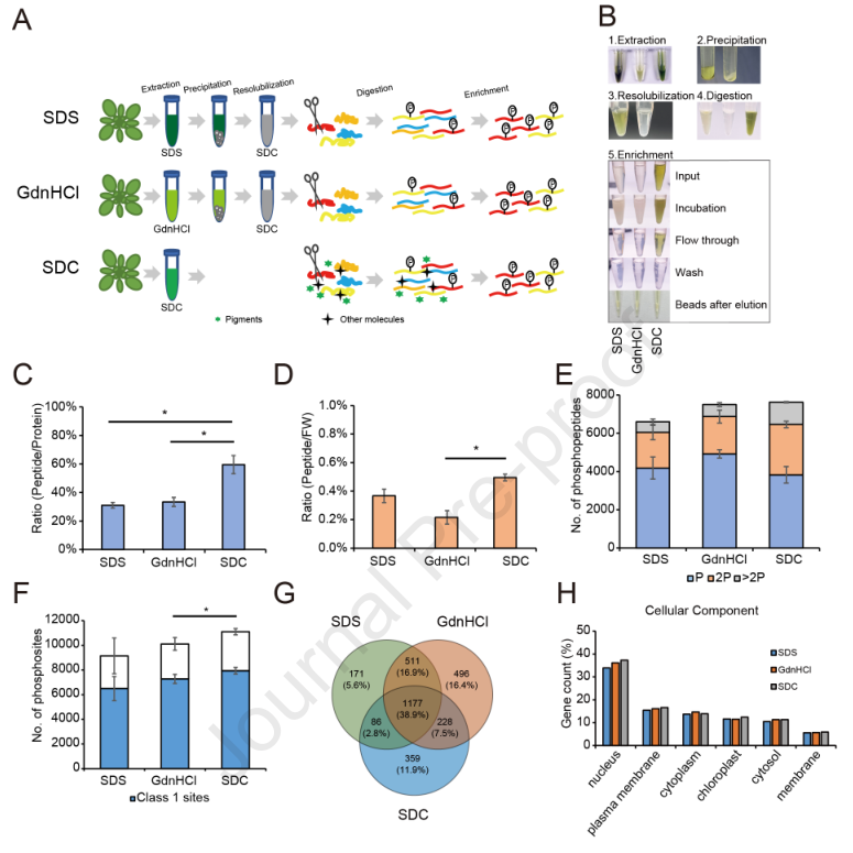從植物組織中高效提取蛋白質(zhì)是深入分析植物蛋白質(zhì)組和磷酸化蛋白質(zhì)組的第一步和關(guān)鍵一步。為此,作者比較了SDS、GdnHCl和SDC等不同變性劑對(duì)擬南芥葉片中蛋白質(zhì)的提取性能。結(jié)果發(fā)現(xiàn)SDS-和SDC-提取的蛋白的性能相似,但優(yōu)于GdnHCl。植物樣品相較于動(dòng)物樣品含有較低濃度的蛋白質(zhì),因此作者優(yōu)化了磷酸化蛋白質(zhì)組的提取和富集的方法,即用SDS或GdnHCl緩沖液提取的蛋白質(zhì)樣品,在蛋白質(zhì)消化和隨后的磷酸肽富集之前,必須去除變性劑(圖1A)。接著用氯仿-甲醇沉淀提取的樣品,去除變性劑和其他干擾生物分子(圖1A和1B)。而作者通過(guò)實(shí)驗(yàn)發(fā)現(xiàn),SDC法提取的蛋白樣本不需要經(jīng)過(guò)氯仿-甲醇沉淀,而鑒定到的磷酸化蛋白更多,同時(shí)需要的植物材料更少。因此作者認(rèn)為SDC法更節(jié)省成本達(dá)到更好的效果,并在番茄、水稻、綠藻等生物中得到驗(yàn)證,從而確定了磷酸化蛋白組學(xué)的方法,稱(chēng)之為GreenPhos。