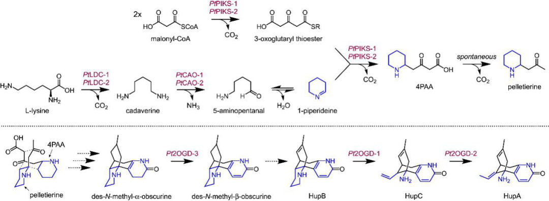 目前研究尚未證實(shí) HupA 生物合成中的任何下游中間體,但從各種苔蘚物種中分離生物堿可能與兩個(gè)含8碳哌啶的亞基摻入石松生物堿的生物合成相關(guān)(圖 1B)。但是詳細(xì)的代謝合成機(jī)制還不清楚。作者通過(guò)與4PAA/peletierine生物合成的 3 個(gè)高度共表達(dá)基因分析,作者發(fā)現(xiàn)了富集最顯著的一類(lèi)酶:Fe(II)/2-氧代戊二酸依賴(lài)性雙加氧酶(2OGDs)(圖2B,C)。作者將這些高度共表達(dá)的2OGD作為下游石松生物堿代謝途徑中的強(qiáng)候選基因。