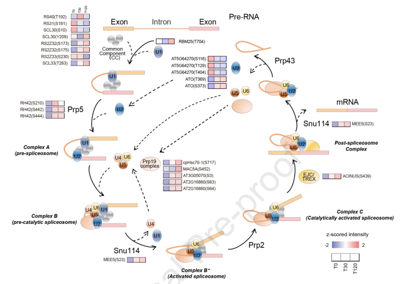 除了激酶外,在簇1、2和4中剪接體被KEGG通路顯著富集 (圖5),暗示磷酸化調(diào)控mRNA的可變剪接,是植物響應(yīng)脅迫的關(guān)鍵過(guò)程。在鹽脅迫下,18個(gè)剪接體蛋白上共有28個(gè)不同的位點(diǎn)被差異磷酸化 (圖7)。利用PRM進(jìn)一步驗(yàn)證了Y209在SCL30上的差異磷酸化(圖6)。據(jù)報(bào)道,RNA解旋酶及其磷酸化對(duì)剪接體的組裝至關(guān)重要。在鹽脅迫30分鐘后,Prp5的S210、S442和S444位點(diǎn)磷酸化增加,并在120分鐘后保持高水平,Prp19的多個(gè)亞基也觀察到類(lèi)似的磷酸化模式(圖7)。盡管這些差異磷酸化事件的意義尚未得到明確的證明,但它們可能參與了鹽脅迫誘導(dǎo)的mRNA剪接的調(diào)控。